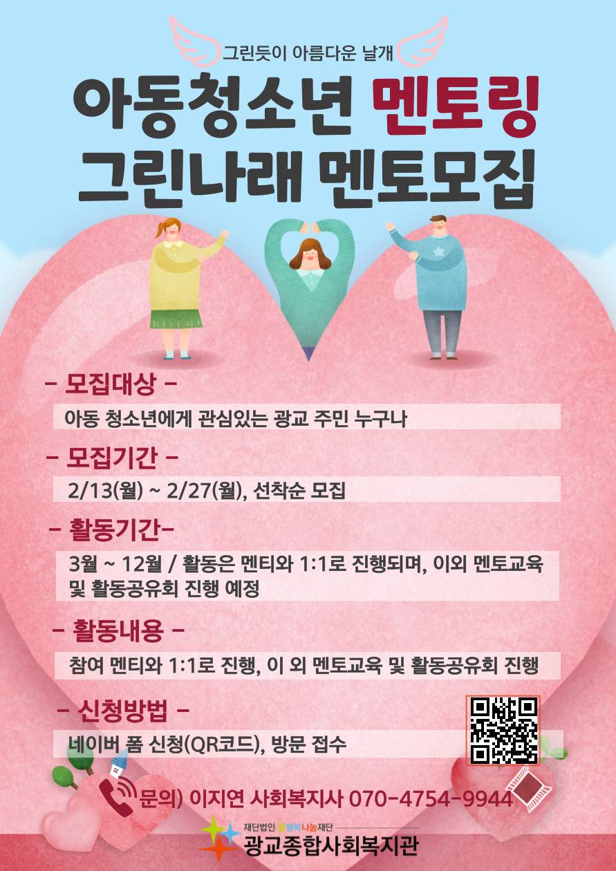 ★2023년 멘토링 그린나래 멘토링 참여자(멘토) 모집★ 1. 봉사 일정 _ 2023. 3. \~ 12. (일정은 조율 가능합니다.) 1) 3월: 담당자와 멘토의 개별 만남(멘토교육) 2) 4월\~12월: 멘티와 멘토의 1:1 멘토링 활동(월 2회) 3) 5월\~12월: 멘토 대상의 활동공유회(연 3회 이상) 2. 봉사 내용 1) 청소년 1:1 멘토링멘토와 멘티의 욕구 및 소통을 통해 자율기획형 멘토링 2) 멘토링 활동계획 및 활동일지작성 3) 봉사장소: 광교종합사회복지관, 지역 인근 학교, 멘티 가정 등 3. 참여대상 1) 멘토링 활동에 관심있는 지역주민 누구나 10명 2) 선착순 모집 4. 신청방법 1) 네이버 폼을 통한 신청(https://naver.me/5ucoHipy)) 2) 방문접수 ★문의) 이지연 사회복지사 070-4754-9944