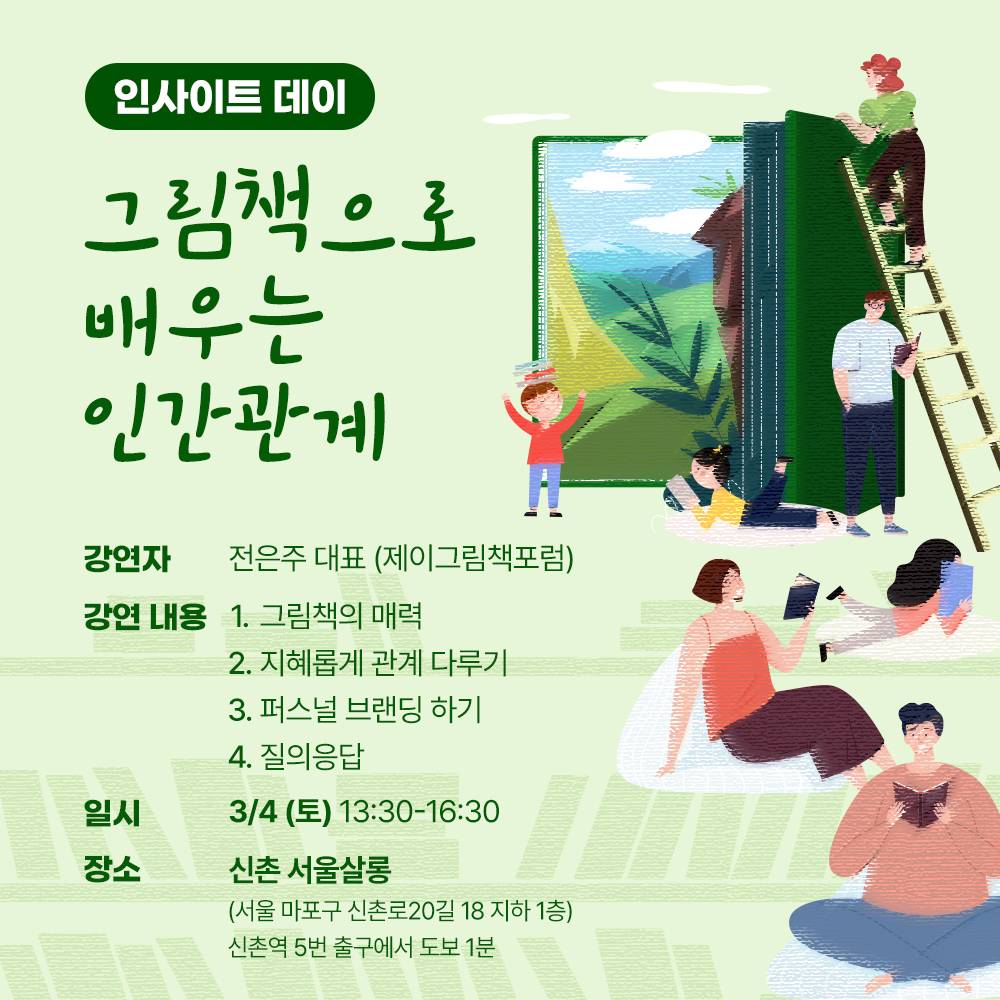 강연자 전은주 대표(제이그림책포럼) 강연 일자 2023년 3월 4일 (토요일) 강연 시간 13:30\~16:30 (총 3시간) 강연 장소 서울 살롱(서울시 마포구 신촌로20길 18 지하 1층) / 신촌역 5번 출구에서 도보 2분 강연 일정 part 1. 그림책의 매력 part 2. 지혜롭게 관계 다루기 part 3. 퍼스널 브랜딩 하기 휴식시간 (10분) 질의응답 (50분) 참가 비용 30,000원 신청 https://naver.me/FqHu2wHq** 주최 아트인사이트