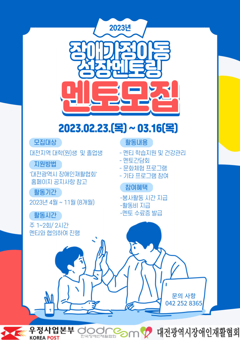 우체국공익재단의 지원을 받아 한국장애인재활협회 주관, 공동수행기관으로 2009년부터 사업을 진행하고 있습니다. 부모님이 장애가 있는 가정의 7 \~ 14세 아동과 주 1회 1:1 일상 및 학습, 문화체험을 통해 밝고 당당한 성장 지원을 함께할 재능 기부자님을 모집합니다. 많은 관심과 참여 부탁드립니다. 감사합니다.