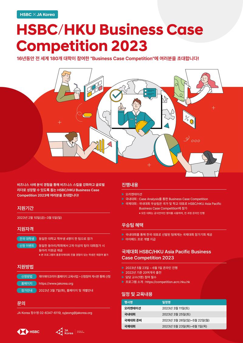 홍콩 비즈니스스쿨(HKU Business School)과 아시아 케이스 리서치 센터(ACRC)가 주관하고 HSBC가 후원하는 HSBC/HKU Asia Pacific Business Case Competition 2023에 여러분을 초대합니다. 본 프로그램은 강의실에서 진행되는 Business Case를 Global Competition으로 전환한 프로그램으로 국내대회는 JA Korea가 주관하여 진행합니다. 비즈니스 사례 분석을 통해 글로벌 관점을 함양하고 미래 글로벌 리더로 성장하고 싶은 대학생 여러분의 많은 관심과 참여 바랍니다.