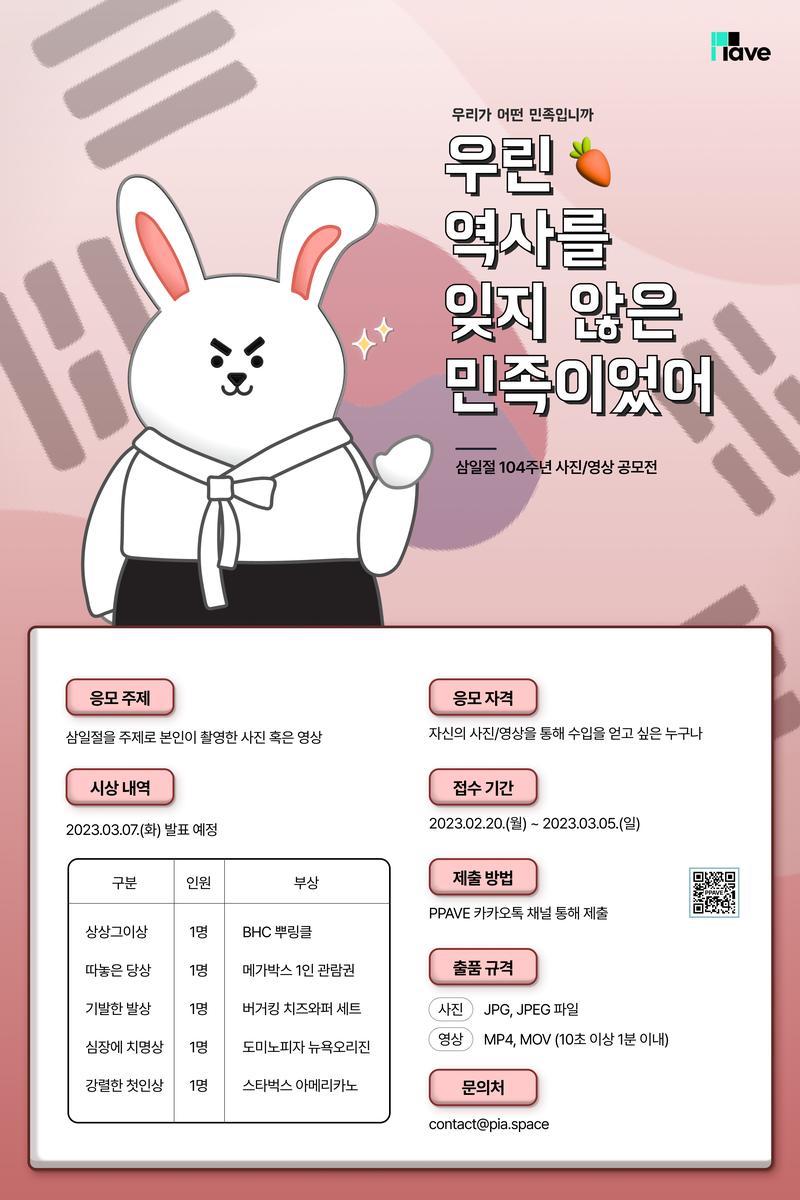 ○ 시상 내역 [ 상상그이상 ] BHC 뿌링클 + 뿌링치즈볼 + 콜라 1.25L [ 따놓은 당상 ] 메가박스 1인 관람권 [ 기발한 발상 ] 버거킹 치즈와퍼 세트 [ 심장에 치명상 ] 도미노피자 (오리지널) 뉴욕오리진 M + 1.25 L [ 강렬한 첫인상 ] 스타벅스 아이스 카페 아메리카노 T ○ 문의처 [ 이메일 문의 ] contact@pia.space [ 카카오톡 채널 문의 ] PPAVE