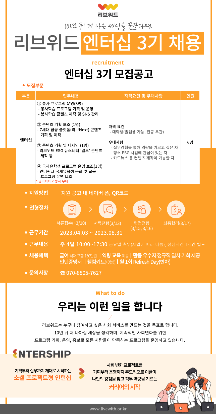혜택내역 - 리브위드 인턴 계약 - 월 1회 Refresh Day(반차) 사용 가능 - 역량교육 제공 : 전문교육업체 역량강화교육 제공 - 활동우수자 리브위드 정규직 입사 기회 제공 - 활동종료시 인턴증명서 발급 - 웰컴키트 + 명함 증정