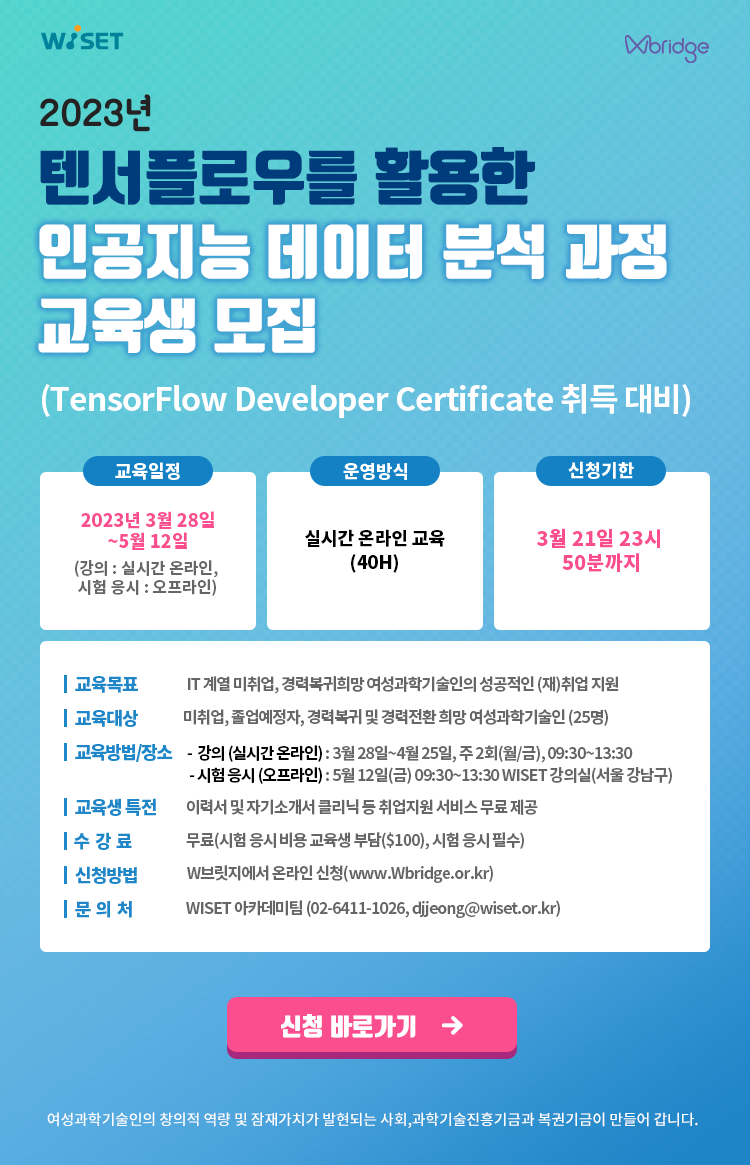※ 수료 조건 : 강의 80% 이상 출석, 텐서플로우 자격증 시험 응시