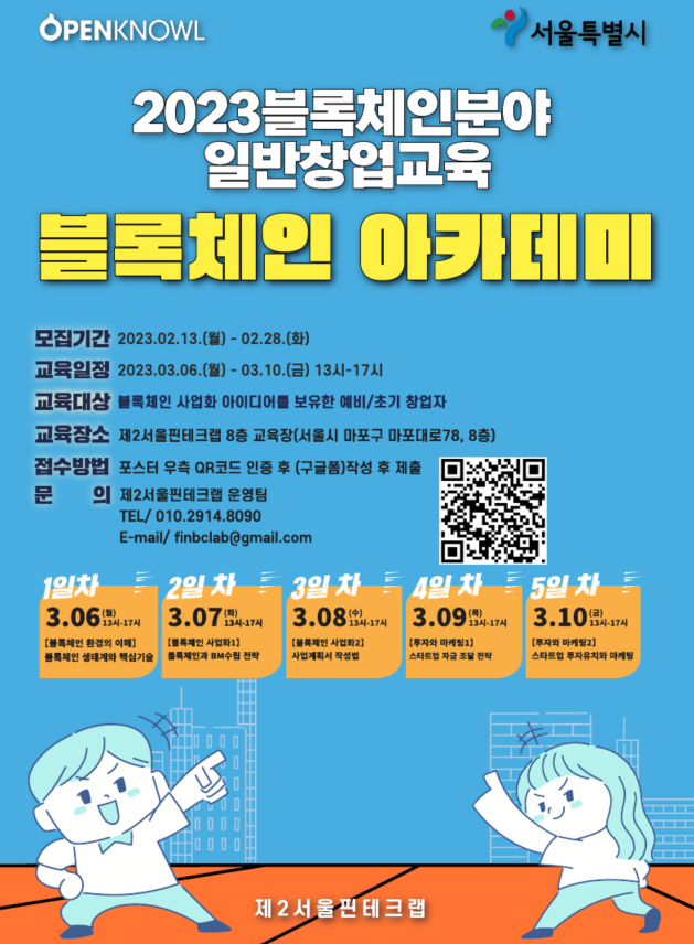 ㅇ 교육일정 : 23년 3월 6일(월) - 3월 10일(금) 매일 13시\~17시 (5일간) ㅇ 참여대상 : 블록체인 분야 창업에 관심있는 일반인, 예비/초기 창업가 등 20명(*선착순 마감) ㅇ 교육내용 :