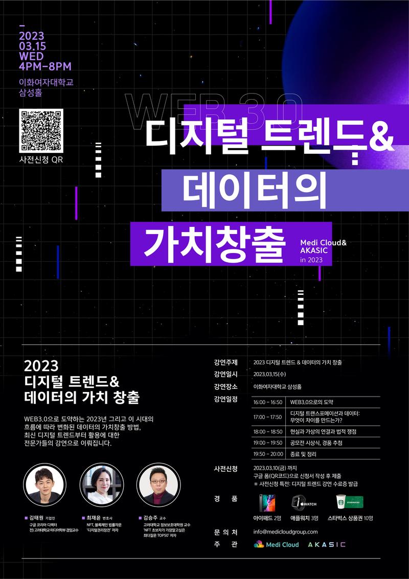 WEB3.0으로 도약하는 2023년 그리고 이 시대의 흐름에 따라 변화된 데이터의 가치창출 방법 최신 디지털 트렌드부터 활용에 대한 전문가들의 강연으로 이뤄집니다.