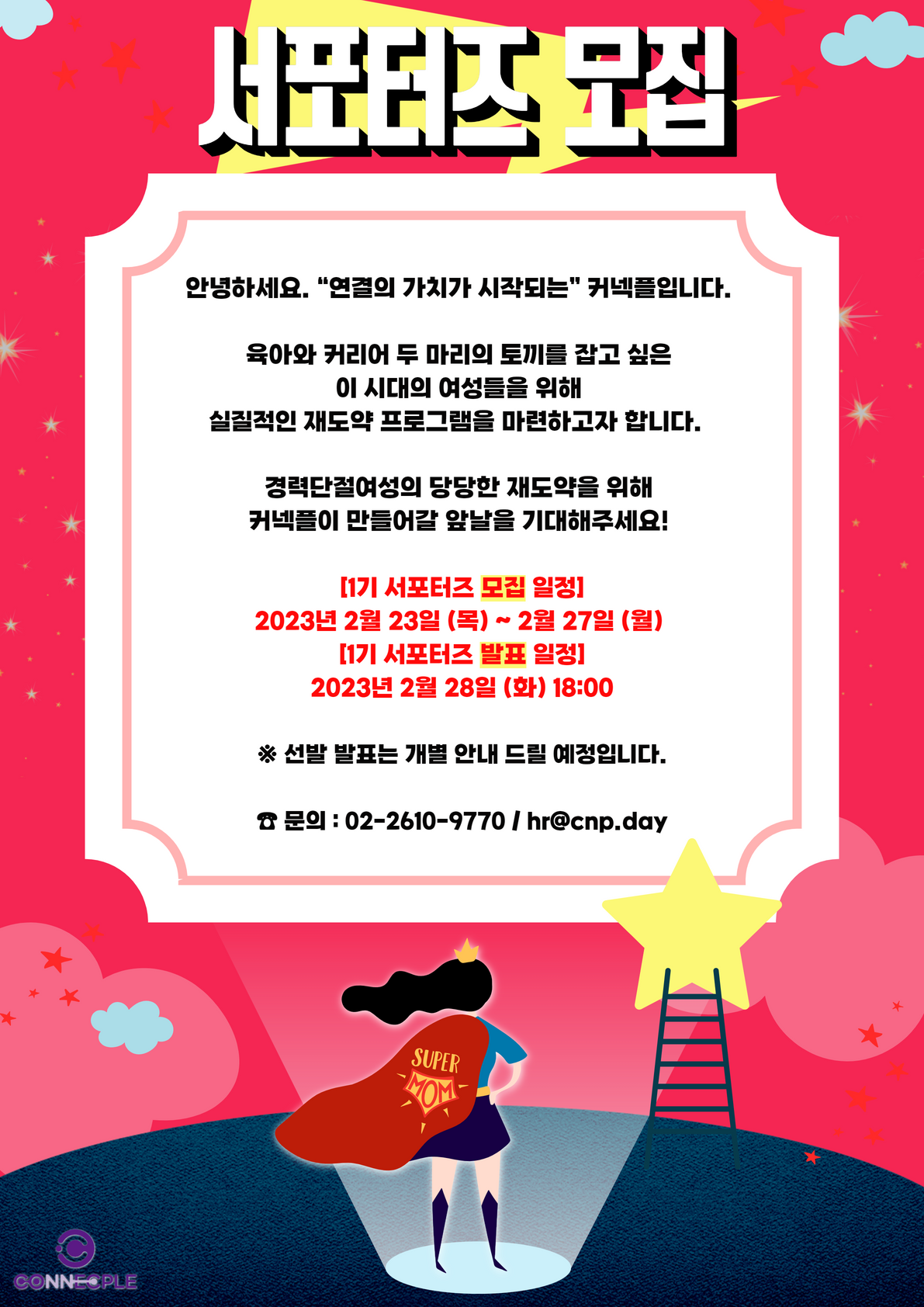 [경력단절여성 재도약 프로그램 서포터즈 모집] (\~2/27 마감!) 안녕하세요. "연결의 가치가 시작되는" 커넥플입니다. 출산, 육아 등의 이유로 잠시 커리어를 접은 여성들의 재도약을 위하여 그리고 육아와 커리어 두 마리의 토끼를 잡고 싶은 이 시대의 여성들을 위하여 실질적인 재도약 프로그램이 지금 마련됩니다. 😊
