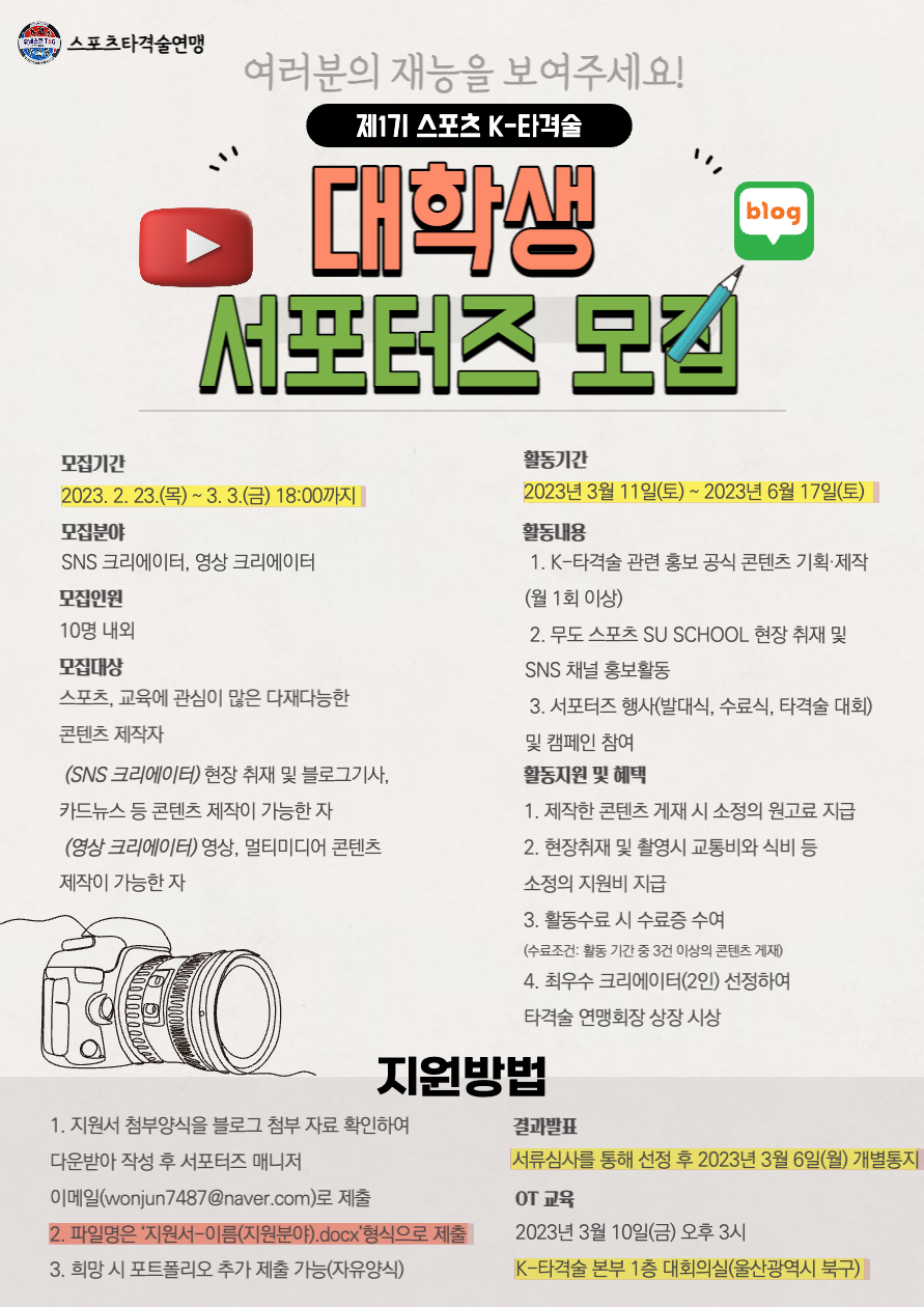 스포츠 K-타격술연맹이 ‘제1기 대학생 서포터즈’를 모집합니다.