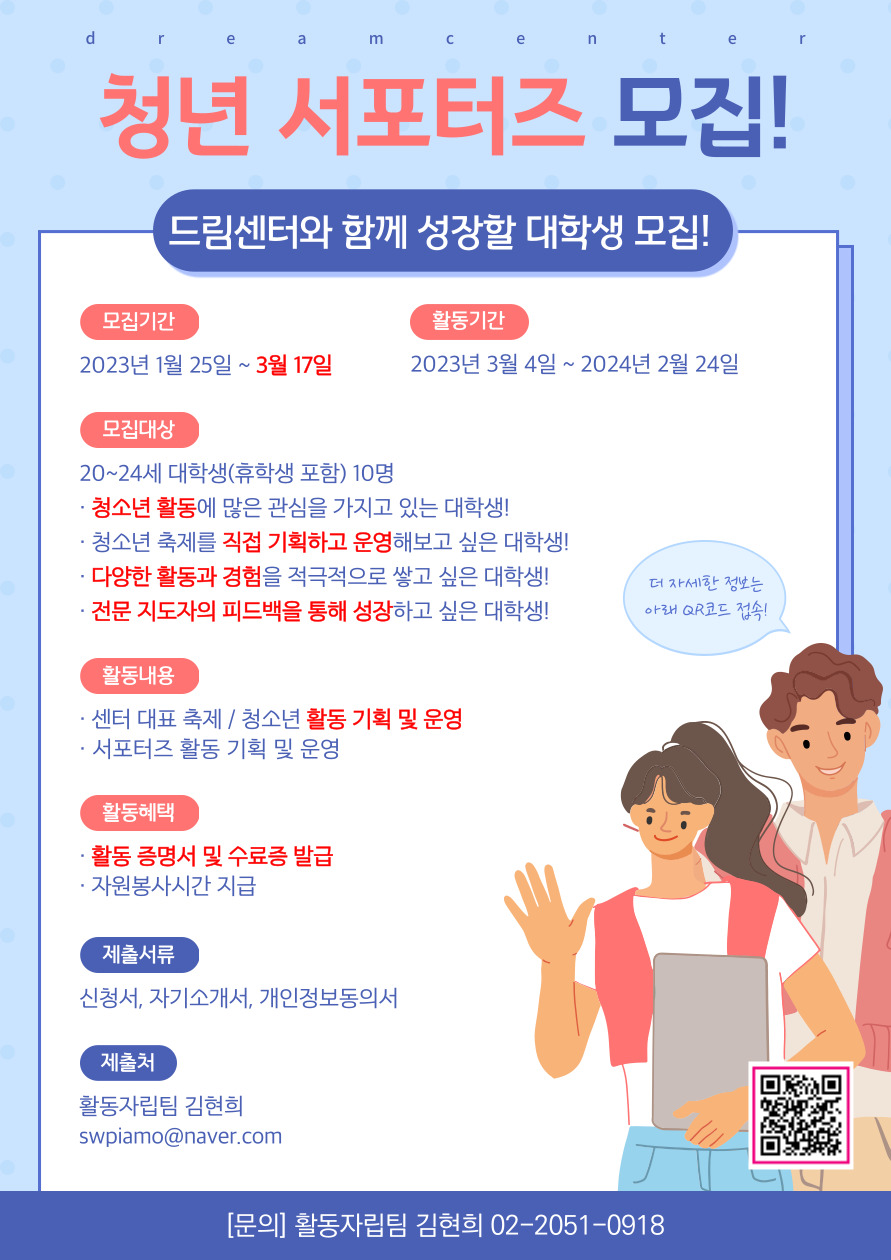 - 모집대상: 20\~24세 대학생(휴학생 포함) 10명 청소년 활동에 많은 관심을 가지고 있는 대학생! 청소년 축제를 직접 기획하고 운영해보고 싶은 대학생! 다양한 활동과 경험을 적극적으로 쌓고 싶은 대학생! 전문 지도자의 피드백을 통해 성장하고 싶은 대학생!