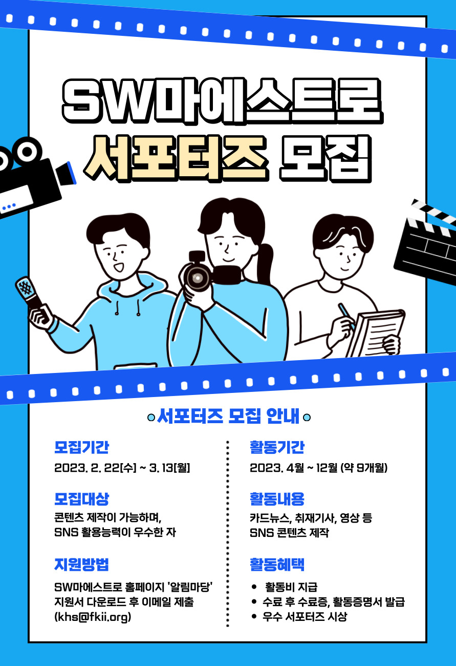 안녕하세요! SW마에스트로 사무국입니다. 2023년 SW마에스트로 7기 서포터즈를 모집합니다.