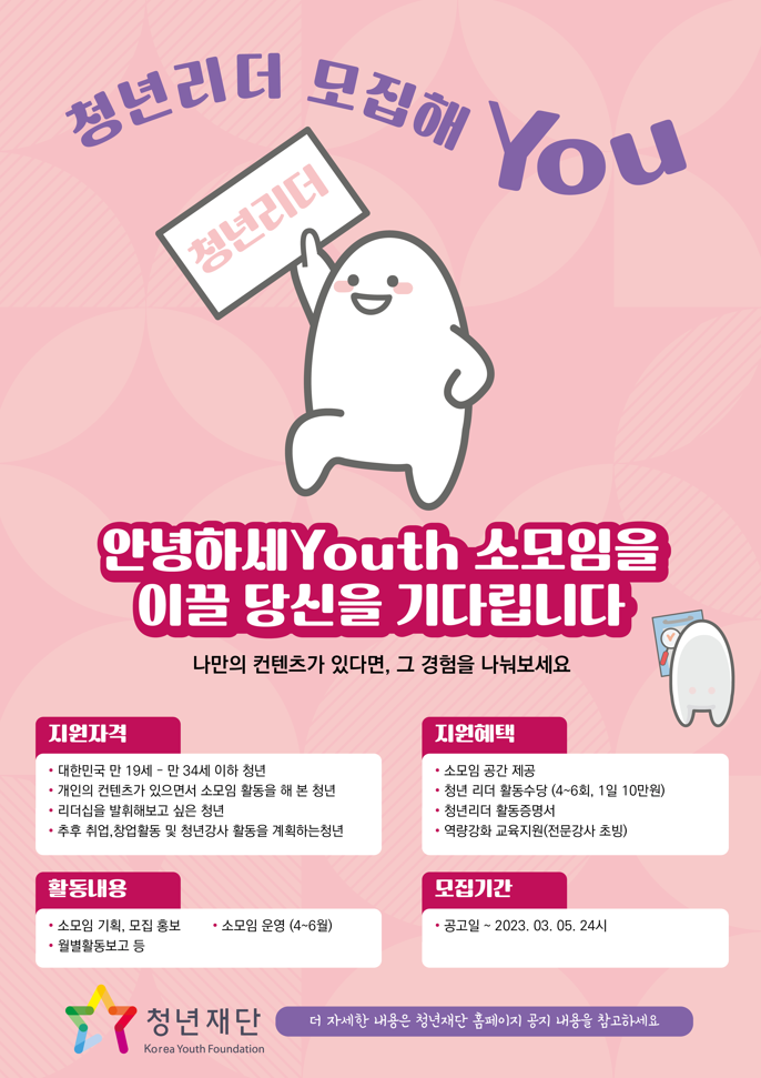 ○ 청년 리더란? - 개인의 컨텐츠가 있으면서 소모임 (5명 이내) 활동을 해보았거나\, 리더십을 발휘해보고 싶은 청년 - 대한민국 국적 만 19세 – 만 34세 이하 청년 - 추후 취업․창업활동 및 청년강사로 활동을 계획하는 청년 ※ 취미․여가 생활과 관련한 컨텐츠가 아닌 또래 성장과 본인의 역량 강화 개발을 위한 소모임 컨텐츠를 우선 선발