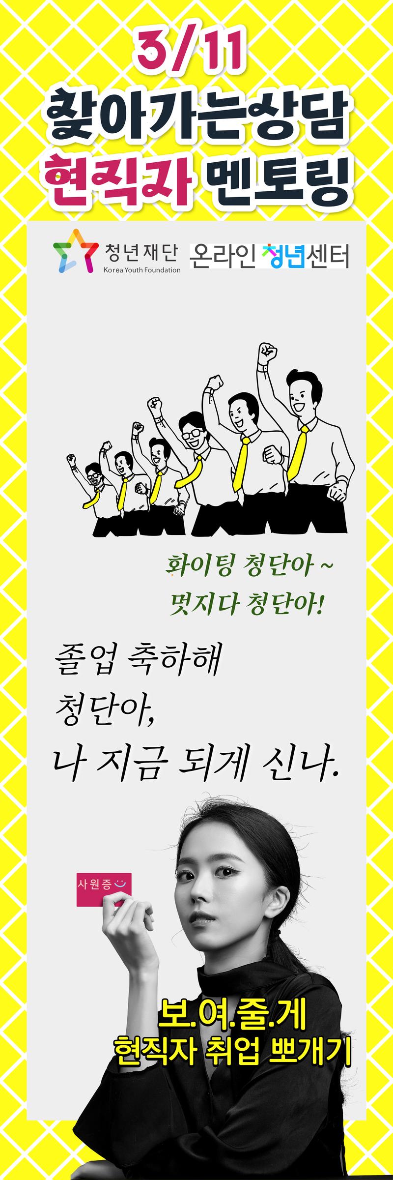 일시 2023 - 03 - 11 (토) 크롬 시크릿모드 /새시크릿창 참여방법 아래 홈페이지 링크 참고 https://kyf.or.kr/user/business/lectureView.do?mentoringId=3431 주제 직무별 현직자와 청년 참여자 1: 3\~4 소규모 멘토링 행사 (상담부스 이용) 섭외멘토: 1) 공공기관 일반행정 1명 2) 외국계 기업 영업지원 1명 3) 중견기업 인사 1명 4) 중견기업 재무회계 1명 5) 교육기관 직업상담사 1명 6) 스타트업 마케팅 1명 모집대상/모집인원 1부, 2부로 각 신청 받음 1부 오전 10:30 \~ 12:00 (20명 이내) 2부 오후 13:30 \~ 15:00 (20명 이내) * 우선 접수 순으로 희망시간대에 배치됩니다. 선착순으로 희망시간대에 마감된 경우 시간대 임의 조정될 수 있습니다. 참가비 : 무료 (기부금을 받아 교육비를 지원합니다. 참여 일정이 확실할 경우에만 신청해주세요.)
