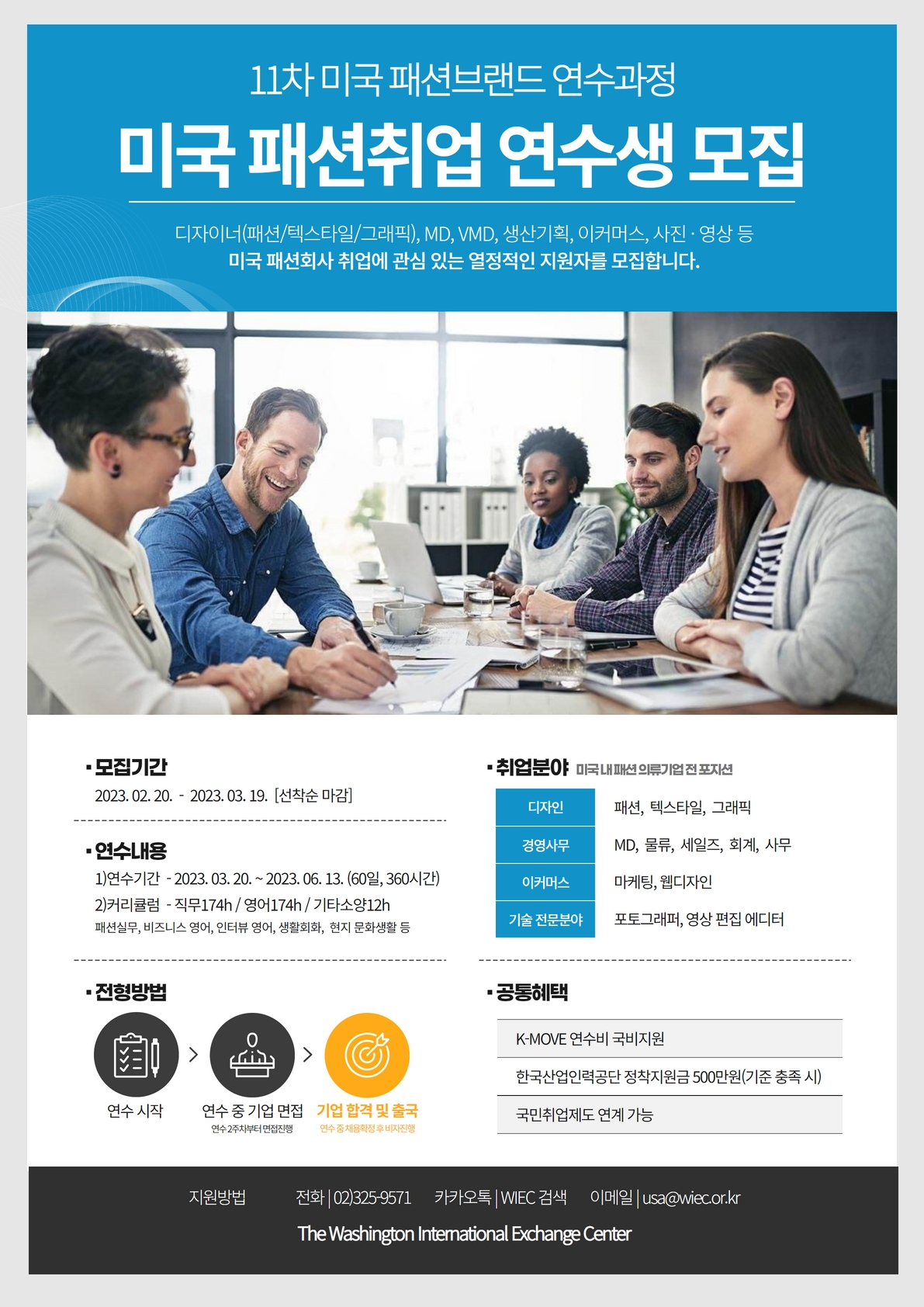 미국 패션 브랜드 연수과정은 해외 패션분야로의 진출을 희망하는 청년들을 대상으로 국내에서 3개월 동안 패션관련 실무교육 및 어학교육을 실시한 후 미국 내 유수한 패션기업에 취업연계 하는 한국산업인력공단의 K-Move스쿨 프로그램입니다. 근무기업은 미 국무성 산하 스폰서재단(비자 허가서 발급기관)의 엄격한 기준(매출액, 직원 수, 산재보험 등)에 충족된 곳으로 선정됩니다. 현재 11차 연수생을 모집 중에 있으니 많은 지원 바랍니다.