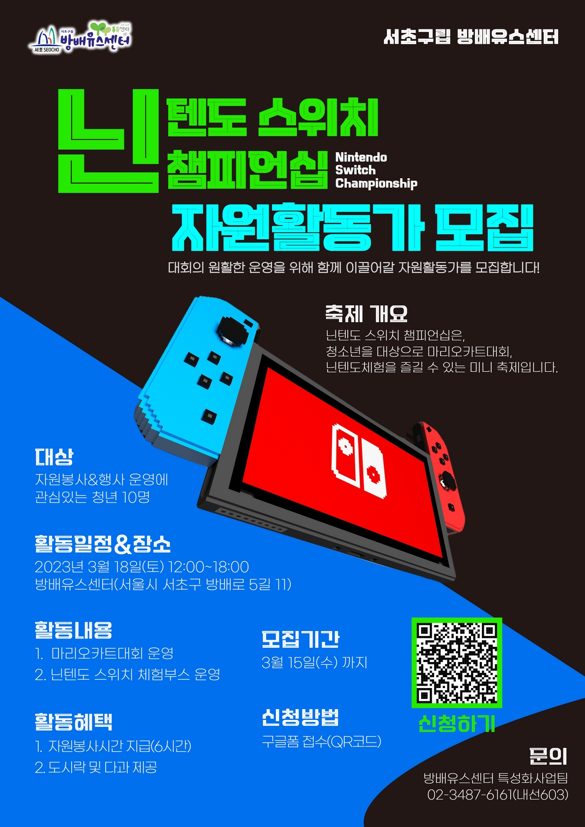 🙌 자원활동 개요 - 일 정 : 2023년 3월 18일(토) 12:00\~18:00 - 장 소 : 방배유스센터(서초구 방배로 5길 11\, 방배역 2번 출구 방향 5분 거리) - 내 용 : 대회 및 게임 부스 운영 - 혜 택 : 1. 자원봉사시간 지급(6시간) 2. 도시락 및 다과 제공