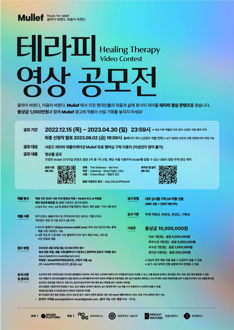 - Mulief 오리지널 콘텐츠 음원 3곡 중 1곡 선정하여\, Mulief를 알릴 수 있는 내용의 힐링 주제 영상 제작