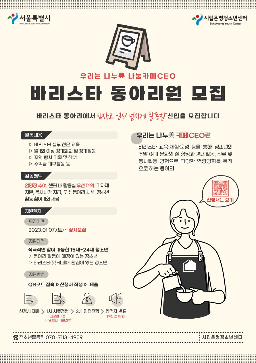 시립은평청소년센터에서 바리스타 동아리[우리는 나누美 '나눔카페CEO'☕]에서 힘차고 열정 넘치게 함께 활동할 신입을 모집합니다🔥 '우리는 나누美 나눔카페CEO'란 바리스타 교육·체험·운영 등을 통해 청소년의 주말 여가 문화의 질 향상과 경제활동, 진로 및 봉사활동 경험으로 다양한 역량강화를 목적으로 하는 동아리입니다😉