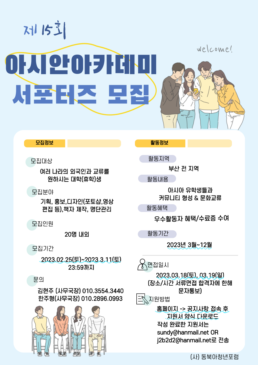 - 모집 분야 : 기획, 홍보, 디자인(포토샵, 영상편집 등), 책자 제작, 명단 관리
