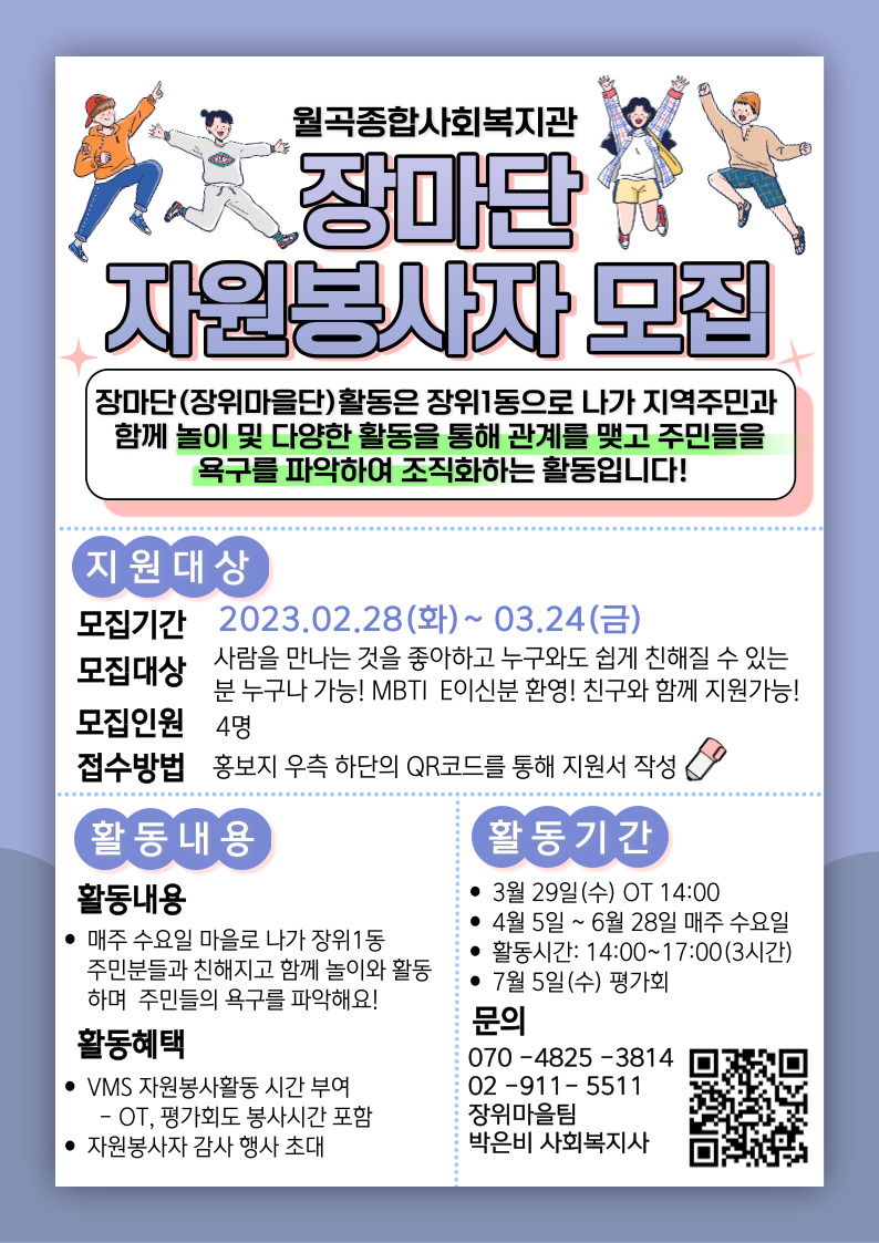 월곡종합사회복지관 장마단 자원봉사자 모집(\~3/24)
