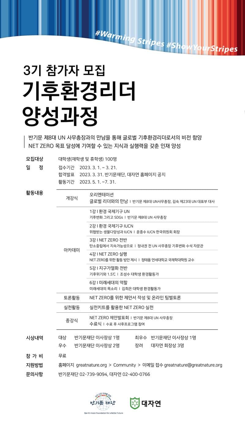 반기문재단x대자연 제3기 기후환경리더 양성과정 참가자 모집 반기문재단과 대자연은 지속가능한 미래를 이끌어 갈 핵심인력 양성에 대학생들과 이들이 미래의 리더로서 성장하는 대학을 주목하고 있습니다. 기후환경리더 양성과정을 통해 반기문 제8대 사무총장과의 만남, 글로벌 환경전문가의 강의 등을 수강하여 기후환경리더로서의 비전을 함양하고 범세계적인 기후환경 문제에 대응할 수 있습니다. 여러분의 많은 관심 부탁드립니다.