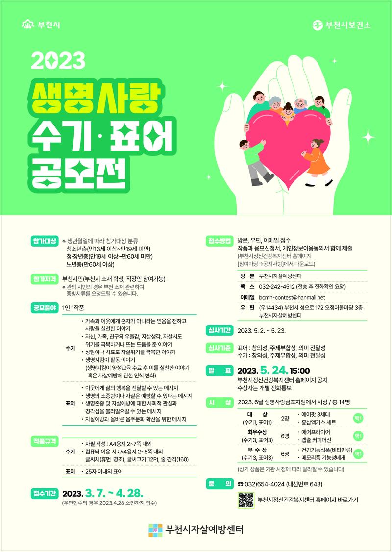 ■ 접수기간** - 접수기간 : 2023. 3. 7. \~ 2023. 4. 28 - 수상작 발표 : 2023. 5. 24 오후15:00 (부천시정신건강복지센터 홈페이지 게시, 당선자 개별연락) - 시상 : 2023.6월 중 생명사랑심포지엄에서 시상