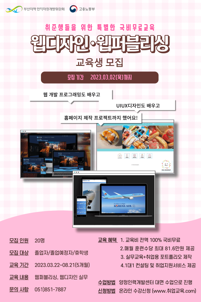 지금 부산전액국비무료로 UIUX디자인과 코딩을 함께 배우고 포트폴리오까지 완성하는 빅데이터분석& 시각화UI콘텐츠개발 과정으로 4차 산업시대 IT분야 취업을 준비하세요! [교육 개요] ■ 프로젝트 중심으로, 문제 해결능력을 키우는 실무교육 ■ 표준웹, 반응형 웹사이트, 쇼핑몰 등 웹 페이지 구현 ■ 교육 수료 후 취업까지 서포트해주는 1:1 취업 컨설팅 [기간 및 일정] ■ 교육기간 : 03.22(수)\~08.21(월) \~ 3/2(목)까지 모집 마감 [교육훈련비] ■ 수강료 부담없이 교육비 국가에서 전액 지원! [지원대상] ■ 졸업자/졸업예정자/휴학생 (내일배움카드 발급대상자) ■ 웹디자인·웹퍼블리싱 취업을 희망하는 분(비전공자 O) [훈련지원금] ■ 수강 기간 동안 매월 훈련수당 최대 81.6만원 제공 [교육 과정] ■ 웹 디자인과 퍼블리싱의 기초부터 실무 프로젝트까지 ■ 빅데이터/모바일/반응형 웹 등 4차 산업시대 취업 특화 ■ 최신 트렌드를 반영한 웹 퍼블리싱 포트폴리오 완성 [지원방법] ■ 홈페이지 수강신청 : https://www.jobyj.co.kr/ [교육장소] ■ 고용노동부 지정 우수훈련기관 양정인력개발센터 (부산 지하철 1호선 양정역 150m 지점) [교육문의] ■ 문의전화: 051)851-7887 / 카카오톡 : edu8989