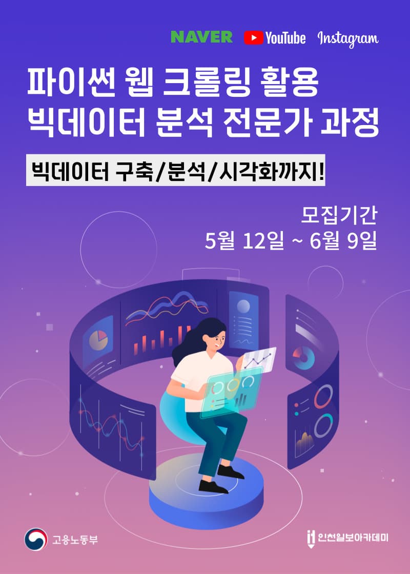 파이썬 웹 크롤링을 활용한 빅데이터 구축, 분석 및 시각화 개발자 양성과정 고용노동부 지정 인천유일 베스트직업훈련기관 인천일보아카데미와 함께 프로그래밍 기초부터 빅데이터 분석과 시각화까지 차근차근 배워보세요! :) 자세히 보기