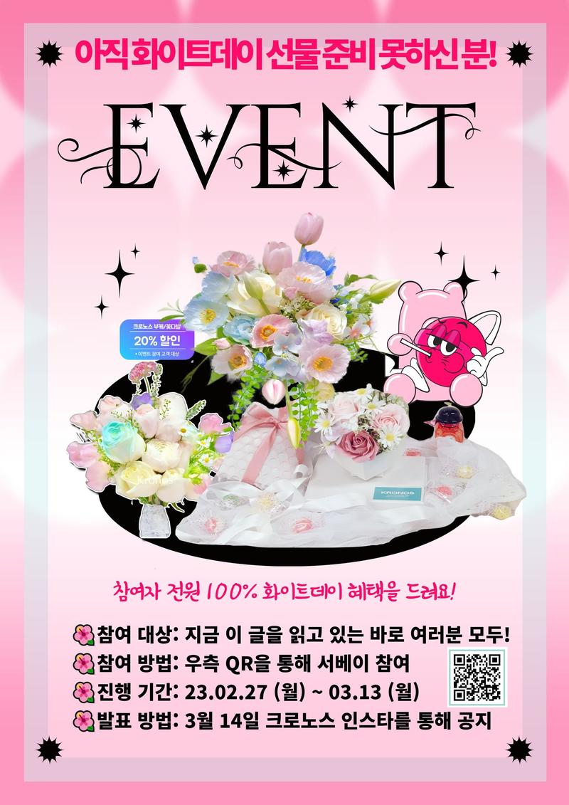 🌼참여 방법: 크로노스 플라워 인스타 팔로우 & 하단 서베이 참여 (30초 소요) 1. 크로노스 플라워 인스타 팔로우: https://www.instagram.com/kronosflower/** 2. 하단 링크 통해 서베이 참여: https://forms.gle/WqEm7cvuEdTgguqZ9