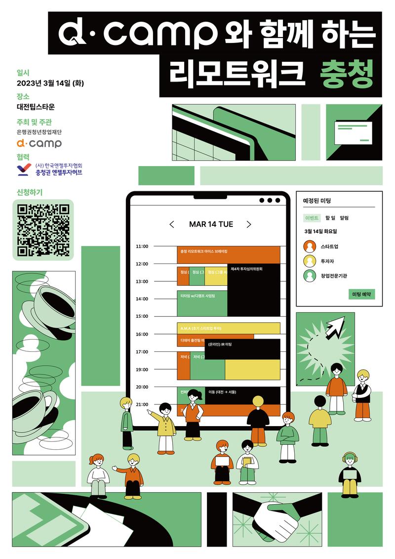 👩 스타트업 관계자들과 네트워킹을 원하시는 분 👦 바쁜 업무에 환기가 필요하신 분 🧑 사람들을 만나며 창업 생태계를 알아가고 싶으신 분! 사업 계획서가 완성되지 않았어도, 특출한 사업 성과가 없더라도 적극적으로 네트워킹할 준비가 된 분이라면 누구든 환영합니다. 3월 14일, d·camp와 대전팁스타운에서 만나요! 프로그램 소개 💻리모트워크 하루 동안 수도권 VC·선배창업가·창업지원기관 관계자와 한 공간에서 근무하며, 자유롭게 티타임을 가질 수 있습니다. 화상회의, 미팅 등 본인의 일정을 소화하며, 자유롭게 일정 조정 가능합니다. ☕️고민나눔 세션 동료창업가/VC와 편안하게 고민을 나누는 시간입니다. 👩👩👧👦 저녁 네트워킹 리모트워크 직후, 참가자들과 함께 인근 식당에서 네트워킹을 진행합니다. 일시 \| 2023년 3월 14일 (화) 10:00 \~ 20:00 └ 리모트워크 10:00 \~ 17:30 / 네트워킹 18:00 \~ 20:00 장소 \| 대전팁스타운 상세내용 \| https://dcamp.kr/event/36327 └ 주요 참가자, 타임테이블 등 상세내용은 공고문을 확인해 주세요! 신청링크 (\~3/12, 일) \| https://forms.gle/yrrJgCeuUJUPDTfv5 └ 3/7(화)부터 참가자 확정 예정이며, 신청인원이 많을 경우 조기마감될 수 있습니다. └ 반드시 참석 가능한 분들만 신청 부탁드립니다. 불가피한 사정으로 참석하지 못할 경우 3/12(일) 자정까지 연락 부탁드리며, 그렇지 않을 경우 향후 디캠프 주최 프로그램에 참석이 어려울 수 있습니다.**