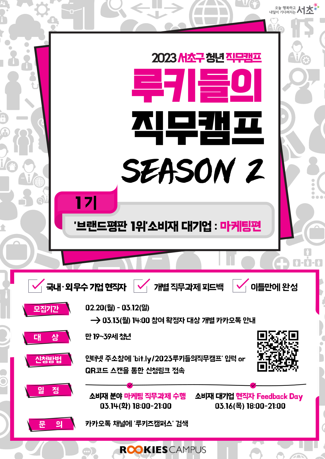 루키들의 직무캠프 SEASON 2가 돌아왔습니다. 이번 1기는 '브랜드평판 1위' 소비재 대기업 현직자와 함께하는 글로벌 마케팅편! 일정? 3/14(화) 저녁 6-9시 소비재 분야 마케팅 직무과제 수행 3/16(목) 저녁 6-9시 소비재 대기업 현직자 Feedback Day 참여혜택? 이틀만에 완성하는 직무캠프를 통해 마케팅 직무과제 수행 후 국내외 대표 기업 현직자로부터 직접 받는 개별 맞춤 피드백까지!