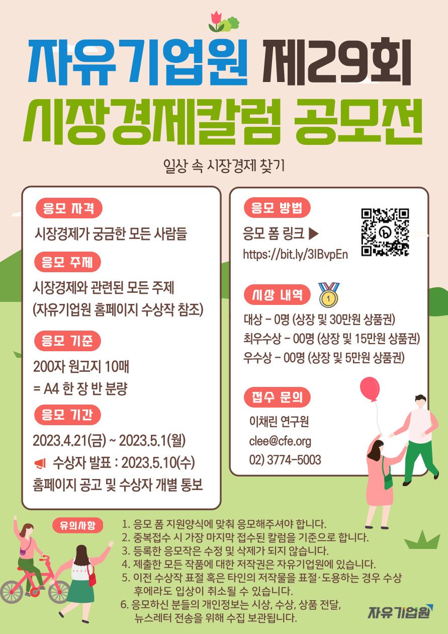 □ 유의사항: 1. 마감 전일부터 사용자 접속이 많아집니다. 적어도 마감 한 시간 전에 미리 등록 부탁드립니다. 2. 중복접수 시 가장 마지막 접수된 칼럼을 기준으로 합니다. 3. 등록한 응모작은 수정 및 삭제가 되지 않습니다. 4. 제출한 모든 작품에 대한 저작권은 자유기업원에 있습니다. 5. 이전 수상작 표절 혹은 타인의 저작물을 표절·도용하는 경우 수상 후에라도 입상이 취소될 수 있으며\, 모든 법적인 책임은 본인에게 있습니다. 6. 응모하신 분들의 개인정보는 시상\, 수상\, 상품 전달\, 뉴스레터 전송을 위해 수집 보관 됩니다.