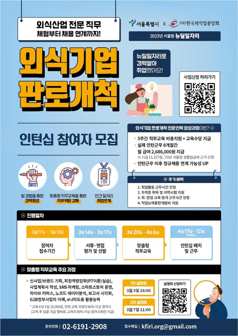 서울특별시 및 (사)한국외식업중앙회는 외식·식품산업 분야에서 외식기업 판로개척 분야의 근무를 희망하는 청년들을 위하여 추진하는 「외식기업 판로개척 전문인력 양성사업」 참여자 모집을 아래와 같이 공고합니다.