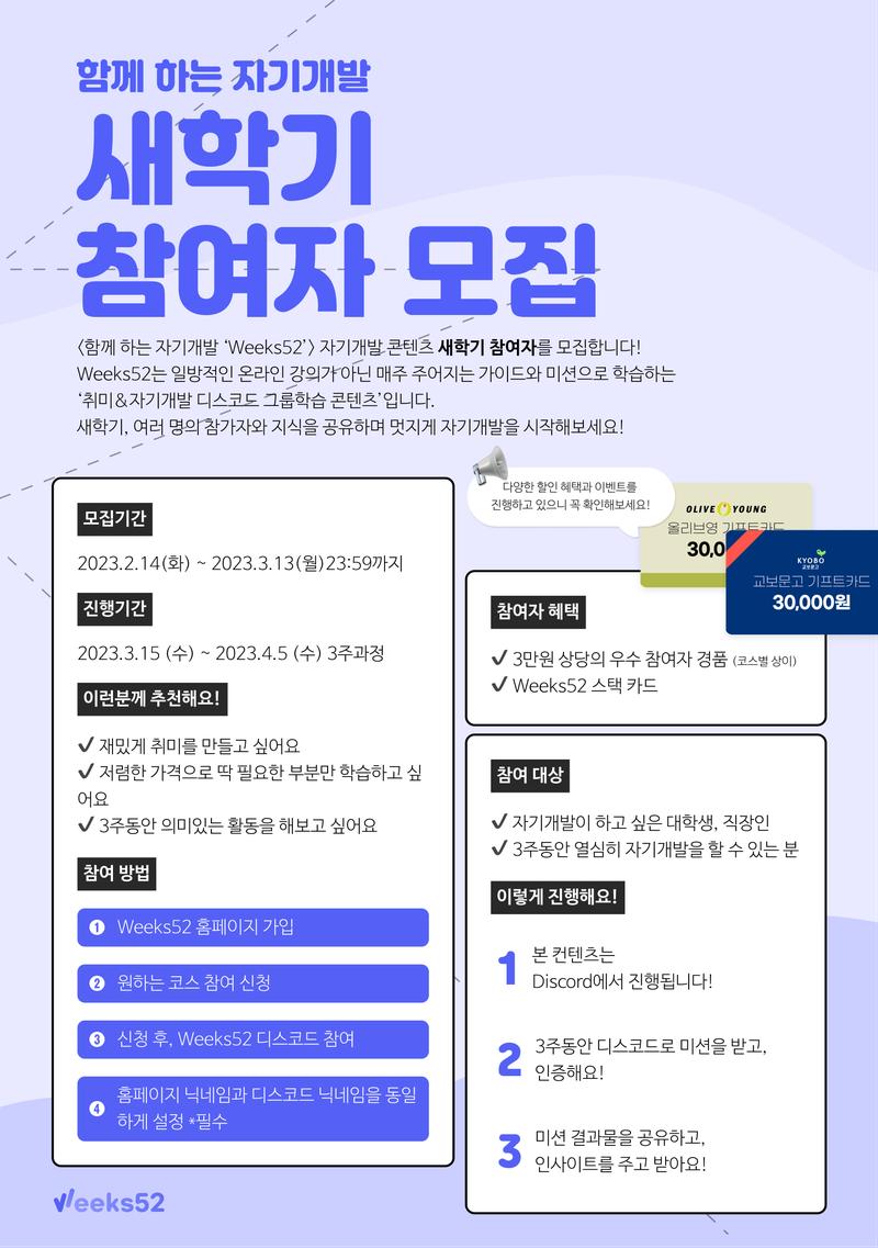 📝 모집 개요 <함께 하는 자기개발 ‘Weeks52’> 자기개발 콘텐츠 새학기 참여자를 모집합니다! Weeks52는 일방적인 온라인 강의가 아닌 매주 주어지는 가이드와 미션으로 학습하는 ‘취미&자기개발 디스코드 그룹학습 콘텐츠’입니다. 새학기, 여러 명의 참가자와 지식을 공유하며 멋지게 자기개발을 시작해보세요!