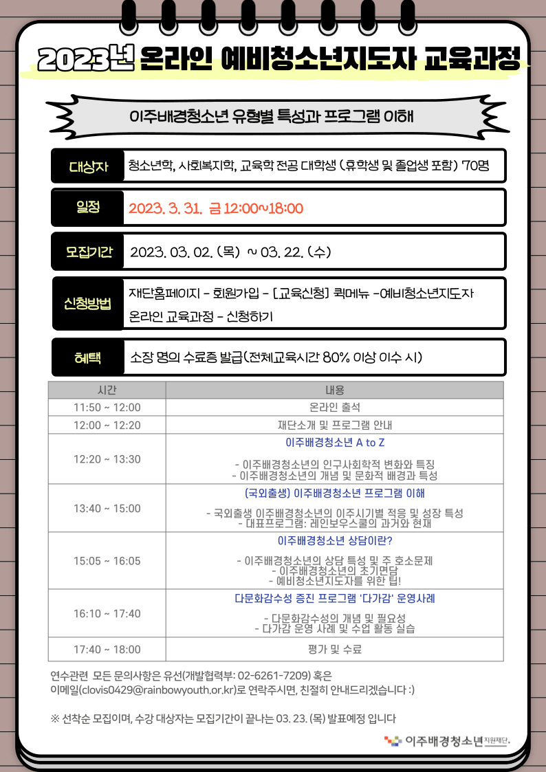 이주배경청소년에 관심있는 예비청소년지도자분들의 많은 관심과 참여 바랍니다:)