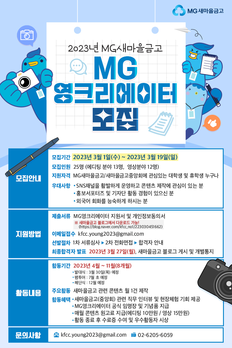 신청 방법 : 제출 서류 : MG영크리에이터 지원서 및 개인정보동의서 신청 방법 : 담당자 이메일(kfcc.young2023@gmail.com)로 서류 제출 선발 절차 : 1차 서류심사 ▶ 2차 전화면접 ▶ 합격자 안내 최종합격자 발표 : 2023년 3월 27일(월), 새마을금고 블로그 게시 및 개별통지