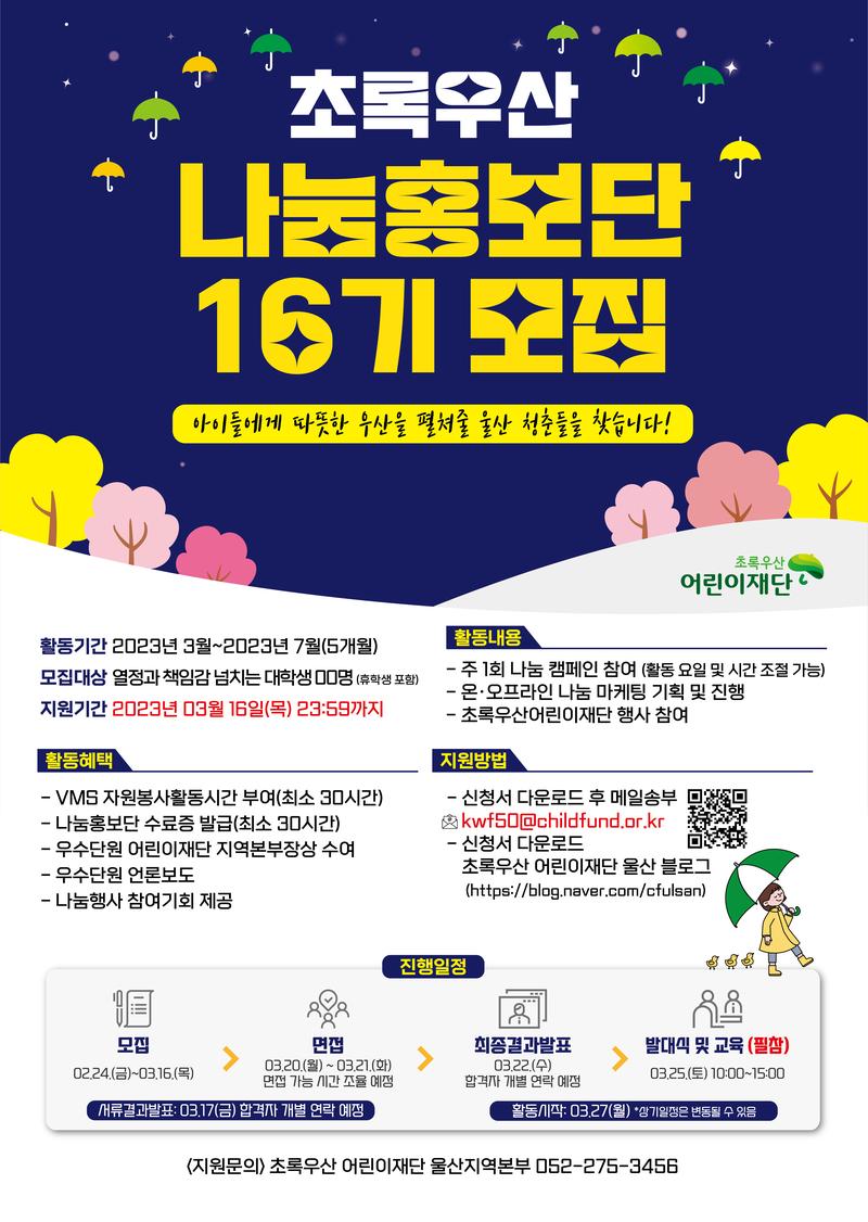 2023 초록우산 어린이재단 울산지역본부 나눔 홍보단 16기 모집 안녕하세요. 초록우산 어린이재단 울산지역본부에서는 아이들이 행복한 세상을 만들기 위해 '초록우산 나눔홍보단 16기' 단원을 모집하고 있습니다. 많은 관심 부탁드립니다. ■ 모집대상 : 열정과 책임감 넘치는 대학생 00명(휴학생 포함) - 주 1회 이상 활동 가능한 청춘(일자/시간 조정 가능) SNS(인스타그램, 블로그 등) 활동을 활발하게 하는 청춘 - 무엇보다 아이들을 사랑하는 청춘 ■ 활동기간 - 2023년 3월\~2023년 7월(5개월) (학사일정에 따라 변동 가능) ■ 주요활동 주 1회 어린이를 돕기 위한 나눔 캠페인 참여 1) 오프라인 나눔 마케팅 기획 및 진행(ex. 지역 내 축제 부스 운영) 2) 온라인 나눔 마케팅 기획 및 진행(ex. 카드뉴스 등) - 초록우산 어린이재단 행사 참여 ■ 대외활동 혜택 - VMS 자원봉사활동시간 부여 - 나눔서포터즈 수료증 발급(최소30시간) - 우수단원 어린이재단 지역본부장상 수여 - 우수단원 언론보도 - 비영리마케팅 경험 및 교육, 나눔행사 참여기회 제공 ■ 모집일정 - 모집 : 02.24(금)\~03.16(목) - 서류결과발표 : 03.17.(금) 합격자 개별 연락예정 (합격여부 및 면접안내는 휴대전화 문자로 안내드립니다) - 면접 : 03.20(월)\~03.21(화) 면접가능시간 조율예정 - 최종결과발표 : 03.22(수) 합격자 개별 연락 예정 - 발대식(필참) : 03.25(토) 10:00\~15:00 * 상기 일정은 변동될 수 있음 ■ 지원방법 지원방법: kwf50@childfund.or.kr 메일 제출 제출서류: 나눔홍보단16기 지원서 1부/자기소개 ppt/1학기 시간표 지원서 양식: 초록우산어린이재단 울산지역본부 블로그(https://blog.naver.com/cfulsan) - 초록우산 16기 모집공고 ■ 문의** : 초록우산 어린이재단 울산지역본부 복지사업팀 박혜진 - 052)275-3456 https://open.kakao.com/o/sIdoLK5e