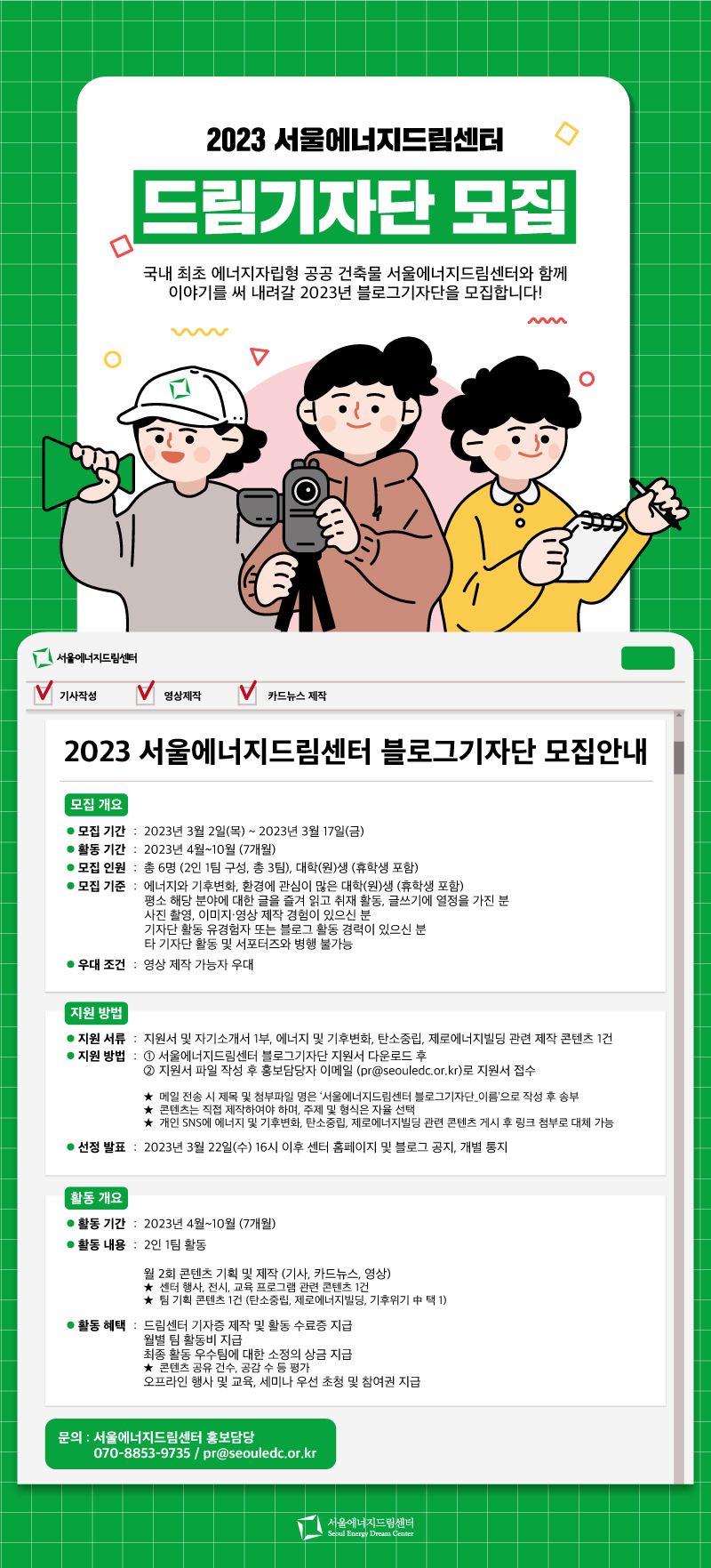 ○ 에너지와 기후변화, 환경 관련 온라인 콘텐츠(기사, 이미지, 영상 등) 기획 및 제작 ○ 센터 전시, 문화행사, 교육 등 내용 확산을 위한 온라인 콘텐츠 기획 및 제작 ○ 현장방문, 스케치, 인터뷰 등 취재 활동을 통한 기자 활동