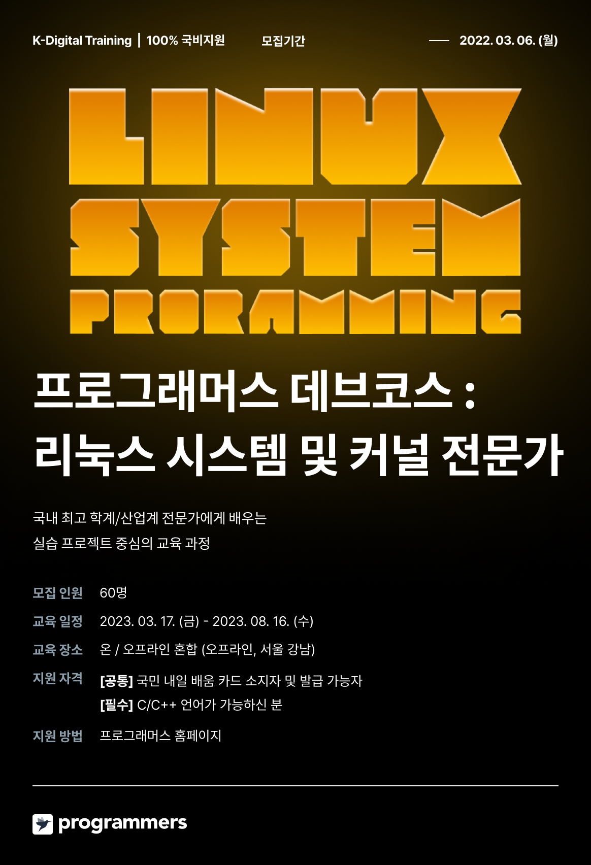 무료 \| 국비지원 100% \| 프로그래머스 리눅스 시스템 및 커널 전문가 데브코스 프로그래머스 리눅스 시스템 및 커널 전문가 데브코스 국내 최고 학계/산업계 전문가에게 배우는 실습 프로젝트 중심의 교육과정