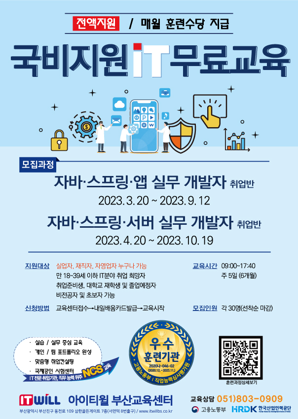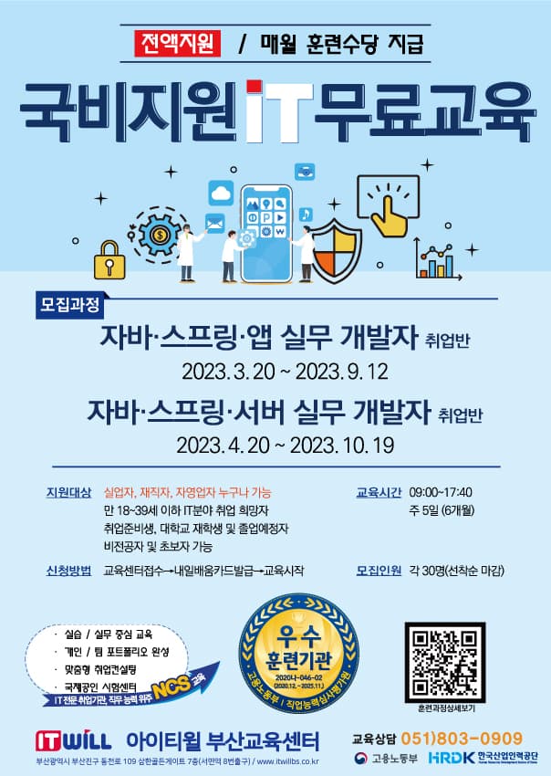 고용노동부 우수훈련기관 아이티윌 부산교육센터 "IT취업교육" 훈련생 모집! ★아이티윌 수강특전★ 국가직무능력표준(NCS)를 기반으로 한 NCS 인증 교육과정 서울 강남 아이티윌과 연계, 희망자 전원 취업 추천 산업체 현장 실무 특강 및 프로젝트 특강 담임제를 통한 주기적인 상담 및 사후관리 센터 운영 카페를 통한 강사핵심노트 및 최신 시험정보 제공 통합 실무프로젝트롤 통한 포트폴리오 완성 ∨ 교육신청 바로가기 https://itwillbs.co.kr/cmn/cnsl/atnl/cnslMain.do ∨ 수강후기 바로가기 https://itwillbs.co.kr/cmn/atnlnRvw/BBSMSTR_000000000042/hrdrvatnlnRvwList.do ■ 교육과정 및 교육일정 자바·스프링·앱 개발자 취업반 - 핀테크 기반 e-커머스 개발자A : 3/20\~9/12 자바·스프링·서버 개발자 취업반 - 클라우드 융합 자바 스프링 백엔드 개발자 : 4/20\~10/19