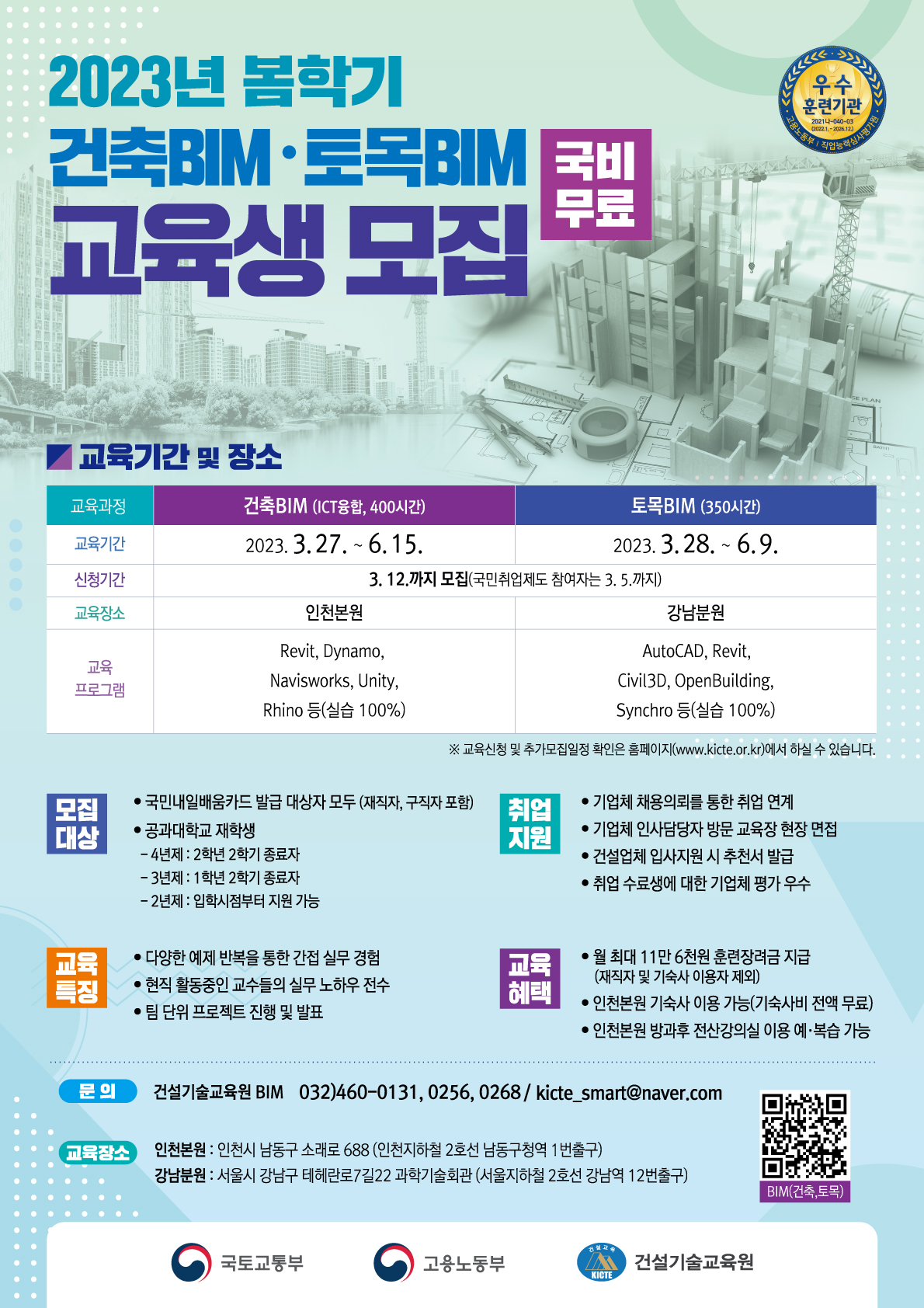 국토교통부 산하 공공기관인 건설기술교육원에서 2023년 봄학기 건축BIM(ICT융합)·토목BIM 교육생을 모집합니다. ■ 공모 주제 - (국토교통부) 2023년 봄학기 건축BIM(ICT융합)·토목BIM 교육생 모집(국비무료) ■ 공모 내용 - 건축BIM(ICT융합, 400시간) 교육생 모집 - 토목BIM(350시간) 교육생 모집 ■ 지원 자격 - 대학생, 취업준비자, 재직자 - 국민내일배움카드 발급자 ■ 모집 기간 - 2023.2.20.\~2023.3.12. ■ 지원 방법 - 건설기술교육원 홈페이지에서 수강신청 - 주소: https://kicte.or.kr/portal/common/02/03/0067/courseViewAction.do ■ 활동 혜택 - 국민내일배움카드 발급시 교육비 전액 무료 - 월 최대 11만6천원 훈련장려금 지급(재직자 및 기숙사 이용자 제외) - 인천본원 기숙사 이용 가능(기숙사비 전액 무료, 숙식 제공) - 인천본원 방과후 전산강의실 이용 예·복습 가능 ■ 문의 사항 - 건설기술교육원 글로벌인재교육실(T. 032-460-0131, 0256) 혜택: 국비 무료교육, 훈련장려금 지급, 교육수료증 발급, 성적우수자 수상, 기숙사 제공