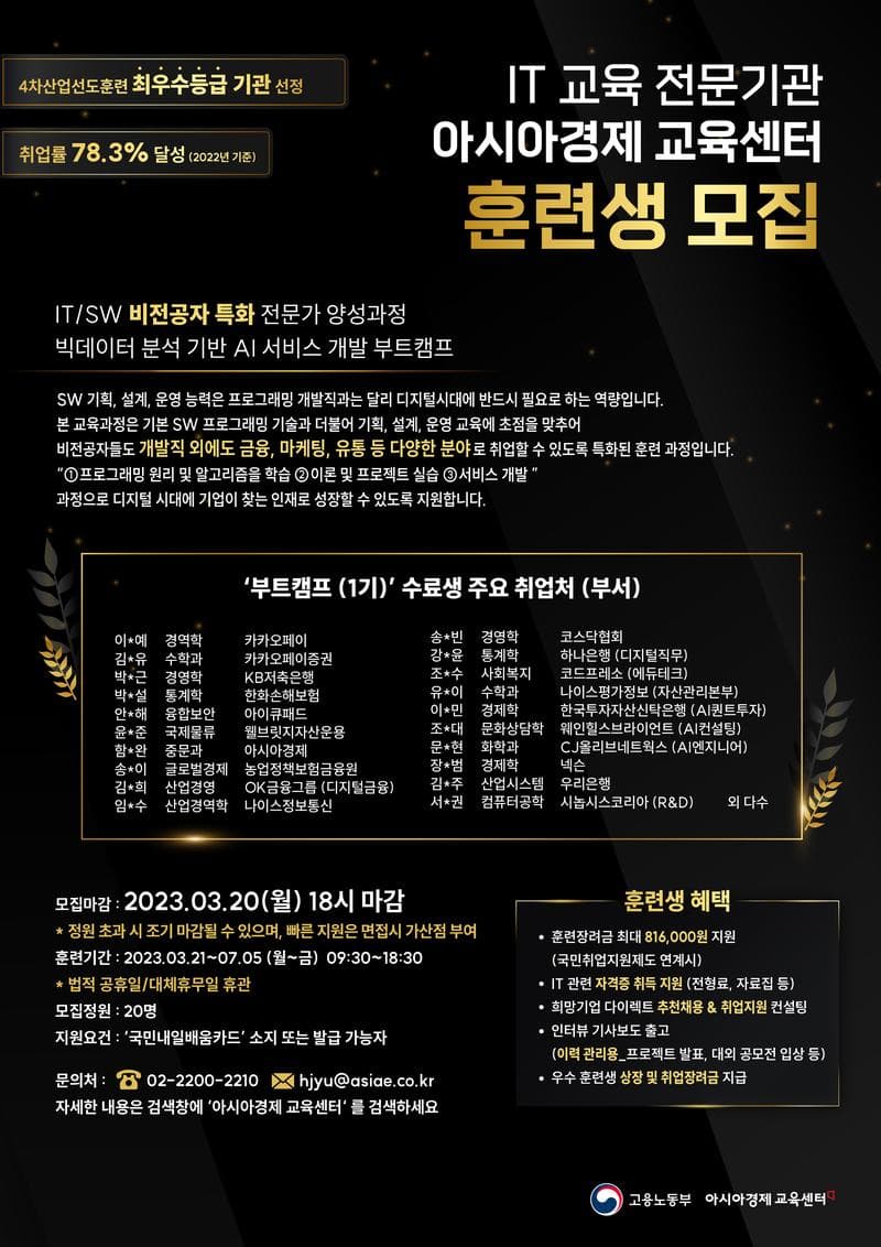 🔴 모집 대상 - '국민내일배움카드' 소지 또는 발급 가능 자 (수강인원의 95%가 비전공자입니다. 비전공자 우대!!) 🔴 참가 비용 교육비, 교재비 포함 ‘일체 무료’ + 훈련장려금 혜택 최대 816,000원 🔴 활동 지역 아시아경제 교육센터 *지하철 3,4호선 충무로역(도보3분), 지하철 2,3호선 을지로3가역(도보 10분)