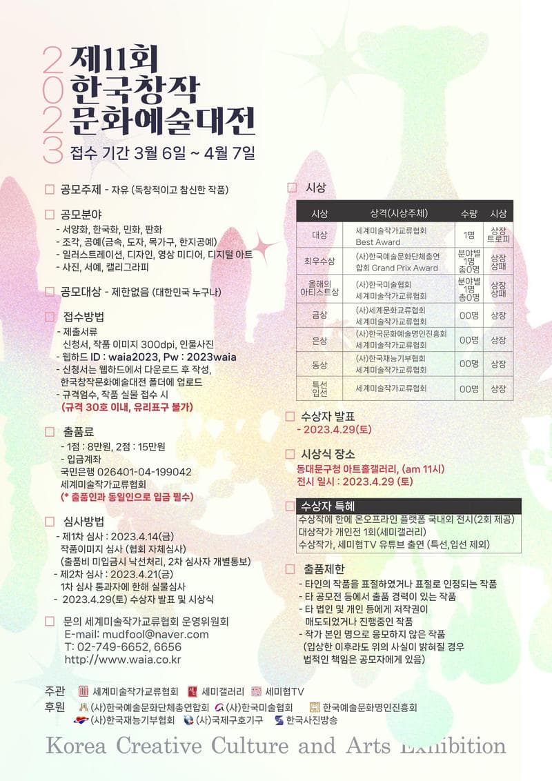 ✶ 공모주제 - 자유 (독창적이고 참신한 작품) ✶ 공모분야 - 서양화, 한국화, 민화, 판화, 조각, 공예(금속, 도자, 목가구, 한지공예), 일러스트레이션, 디자인, 영상 미디어, 디지털 아트, 사진, 서예, 캘리그라피 ✶ 공모대상 - 제한없음 (대한민국 누구나) ✶ 접수기간 - 2023년 3월 6일 \~ 4월 7일 ✶ 접수방법 - 제출서류 신청서, 작품 이미지 300dpi - 웹하드 ID : waia2023, Pw : 2023waia - 신청서는 웹하드에서 다운로드 후 작성, 한국창작문화예술대전 폴더에 업로드 - 규격엄수, 작품 실물 접수 시 (규격 30호 이내, 유리표구 불가) ✶ 출품료 - 1점 : 8만원, 2점 : 15만원 - 입금계좌 국민은행, 026401-04-199042 세계미술작가교류협회 (* 출품인과 동일인으로 입금 필수) ✶ 출품제한 - 타인의 작품을 표절하였거나 표절로 인정되는 작품 , 타 공모전 등에서 출품 경력이 있는 작품, 타 법인 및 개인 등에게 저작권이 매도되었거나 진행중인 작품, 작가 본인 명으로 응 모하지 않은 작품 ( 입상한 이후라도 위의 사실이 밝혀질 경우 법적인 책임은 공모자 에게 있음) ✶ 심사방법 - 제1차심사 : 2023. 4. 14 금) 작품이미지 심사 (협회 자체심사) (출품비 미입금시 낙선처리, 2차 심사자 개별통보) - 제2차 심사 : 2023. 4. 21 금) 1차 심사 통과자에 한에 실물심사 - 2023. 4. 29 토) 수상자 발표 및 시상식 ✶ 시상 대상 / 세계미술작가교류협회, Best Award 최우수상 / (사)한국예술문화단체총연합회 Grand Prix Award 올해의 아티스트상 / (사)한국미술협회, 세계미술작가교류협회) 금상 / (사)세계문화교류협회, 세계미술작가교류협회 은상 / (사)한국문화예술명인진흥회, 세계미술작가교류협회 동상 / (사)한국재능기부협회, 세계미술작가교류협회 특선, 입선 / 세계미술작가교류협회 ✶ 수상자 특혜 수상작에 한에 온오프라인 플랫폼 국내외 전시(2회 제공) 대상작가 개인전 1회(세미갤러리) 수상작가, 세미협TV 유튜브 출연 (특선,입선 제외) ✶ 시상식 장소 동대문구청 아트홀갤러리, (am 11시) 전시 일시 : 2023.4.29 (토) ✶ 문의 세계미술작가교류협회 운영위원회 E-mail: mudfool@naver.com T: 02-749-6652, 6656 http://www.waia.co.kr