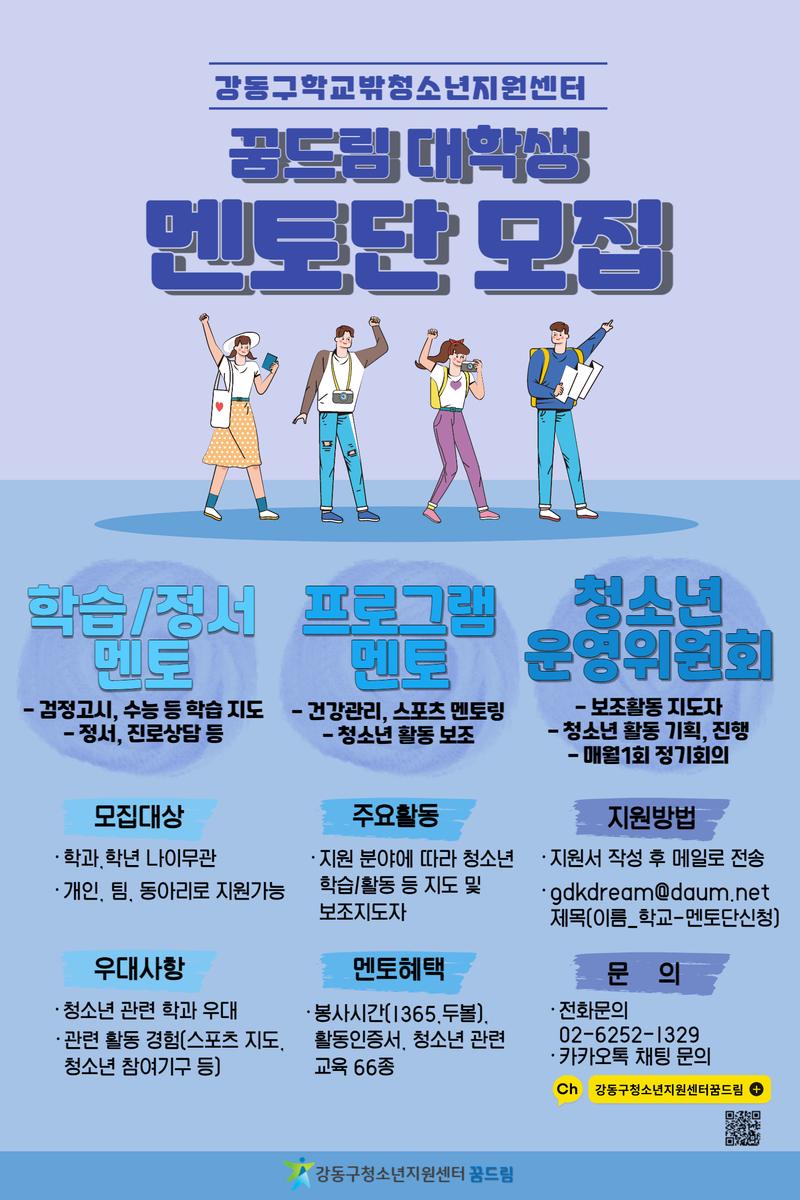 👉 지원방법 : 강동구청소년지원센터 홈페이지에서 지원서(한글파일) 다운로드 후 작성. gdkdream@daum.net (제목: 이름_학교-멘토단신청)메일 제출