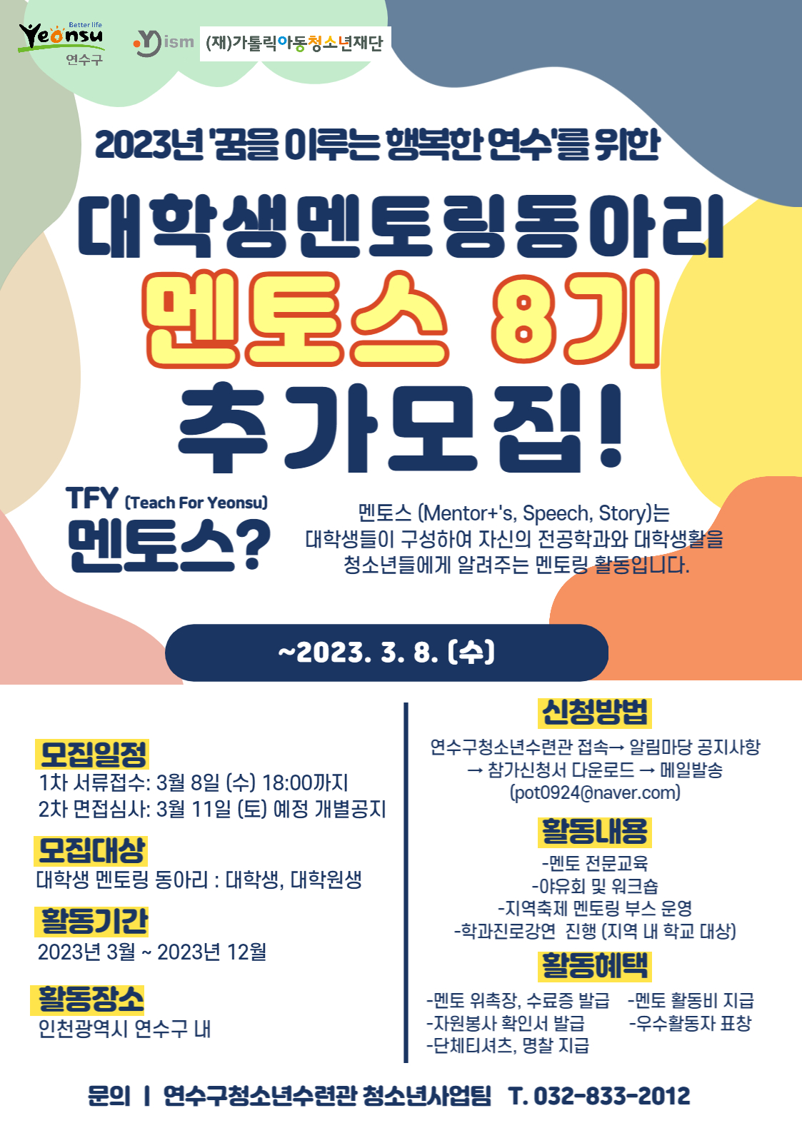 연수구청소년수련관 청소년 멘토링 TFY '대학생멘토링동아리-멘토스 8기' 동아리원을 추가모집합니다!! 붙임서류를 참조하시어 많은 관심과 지원을 바랍니다!! 연수구 청소년들의 멘토가 되어주세요♡