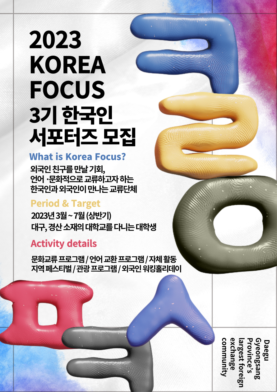 KOREA FOCUS란?: 대한민국에 거주하는 외국인에게 한국 생활에 도움이 되는 정보를 제공하고, 한국인과의 직·간접적 소통을 할 수 있는 글로벌 커뮤니티입니다.대구·경북 최초 외국인 교류단체로 2017년 시작하여, 외국인 및 한국인 학생들이 모두 만족할 수 있는 프로그램을 운영하고 있습니다. 코로나 이후 첫 오프라인 활동이며, 한국인 운영진, 외국인 친구들과 함께 1학기 동안 '글로벌하게' 즐겨 볼 열정적인 대학생 서포터즈 분들을 모십니다.