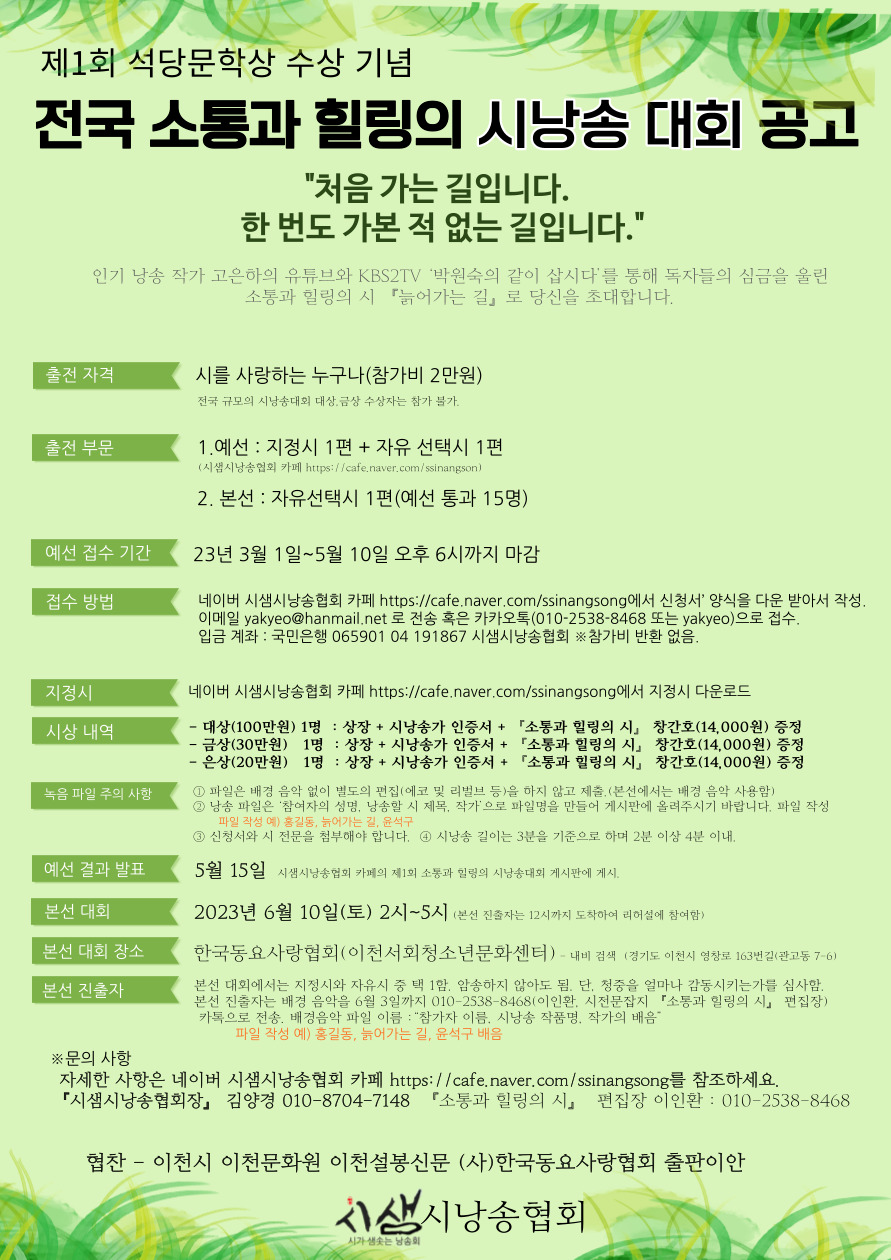 ▶접수 방법 : 네이버 시샘시낭송협회 카페 https://cafe.naver.com/ssinangsong에서 소통과 힐링의 시낭송대회 메뉴에서 ‘소통과 힐링의 시낭송대회 신청서’ 양식 다운 받아서 작성 후, 참가비 입금 후에