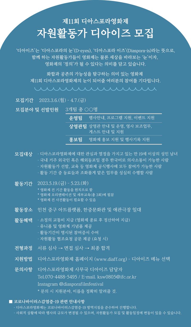 ■ 코로나바이러스감염증-19 관련 안내사항 - 디아스포라영화제는 코로나바이러스감염증-19 방역지침을 준수하여 진행합니다. - 사회적 상황에 따라 행사의 규모가 변경될 수 있으며\, 자원활동가 모집 및 활동일정에 변동이 있을 수 있습니다.