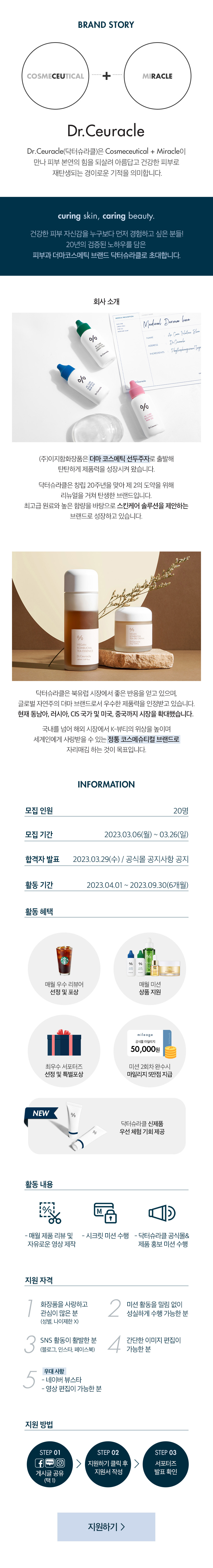 ▶내용 더마 코스메슈티컬의 선두주자 (주)이지함화장품에서 브랜드 닥터슈라클 온라인 서포터즈 <클레버 리더 11기>를 모집합니다. 성별/나이제한 없이 화장품을 사랑하는 분이라면 누구나 지원 가능하니 많은 지원 바랍니다. [활동내용] - 제품 관련 리뷰 및 콘텐츠 제작 - 매월 정기 미션 수행 (블로그\, 개인 SNS 리뷰 업로드\, 공식몰 후기 작성) - 브랜드 홍보 및 온라인 바이럴 활동 (마케팅 주력 제품 및 브랜드 뉴스 등) - 시크릿 미션 수행 [활동기간] - 2023.04.01 \~ 2023.09.30 (6개월) [혜택내역] - 활동 종료 후 클레버리더 활동 수료증 지급 - 닥터슈라클 신제품 우선 체험 기회 제공 - 월별 우수 리뷰어에게 별도 포상 - 최우수 서포터즈 특별 포상 - 미션 2회차 완수 시 공식몰 마일리지 5만점 지급 - 추후 우수 활동자 대상 채용 시 입사 가산점 부여 [안내사항] - 합격자 발표는 3월 29일(수) 닥터슈라클 공식몰 홈페이지 공지사항 게시판에 안내 예정입니다. - 최종 합격자에 한해 개별 안내 메일 발송됩니다 - 오프라인 면접 및 발대식은 진행하지 않습니다. - 서포터즈 활동 시 닥터슈라클 공식몰 회원가입은 필수입니다. ▶ 지원 신청 관련 링크 - 서포터즈 모집 공고 SNS 공유 (블로그\, 인스타그램\, 페이스북 택 1) - 구글 폼을 통해 지원서 작성: https://docs.google.com/forms/d/e/1FAIpQLSec4q0gbjmk_lj3wxDrdDdSfQd2glBKqPAOqYnVKNj8ozuvfA/viewform ▶ 공식 홈페이지/블로그 및 SNS - 홈페이지 : https://www.lghmall.co.kr/main/index.php - 블로그 : https://blog.naver.com/ljhcosmetics - SNS(인스타그램): https://www.instagram.com/dr.ceuracle/