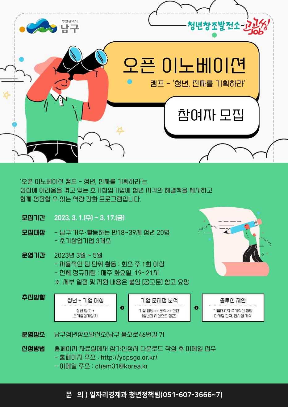 2. 사업개요 - 사업명 : 오픈 이노베이션 캠프(청년 진짜를 기획하라) - 기간 : 2023년 3월 21일(화) \~ 5월 23일(화)\, 8주 - 대상 : 부산광역시 남구에 거주하거나 활동하는 만 18\~39세 청년 18명(6팀) - 내용 : 청년의 아이디어로 기업의 문제를 해결 - 장소 : 청년창조발전소 - 추진방법 : 팀 단위 과제수행 및 기업대표의 피드백 제공 (청년+기업 매칭 > 기업 문제점 분석 > 솔루션 제안)