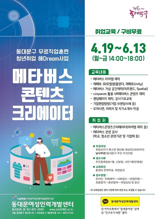 제페토 빌드 제작(3D hous, world, 제페토 3D모델링, cospaces를 활용한 VR메타버스 콘텐츠 제작 기초, 기업현장탐장, 강사기초교육 등의 훈련을 실시하여 메타버스를 이해하고, 강사 및 메타버스크리에이터로 활동할 수 있는 인재를 양성한다. 1. 교육기간 2023. 4. 19∼ 6.13(월∼금) 14:00-18:00 (총35일/140시간) 2. 취업전망 메타버스콘텐츠크리에이터(아이템제작 등) 메타버스관련 강사(학교, 청소년관련기관 및 기업체 등) 3. 교육내용 제페토빌드 콘텐츠제작: 3DHouse제작, World 제페토3D모델링(블렌더프로그램, 제페토Unity) 메타버스 가상 전시회공간제작(이프랜드, Spatial) VR메타버스 콘텐츠 제작 랜딩페이지제작, 강사기초교육(강의에 필요한 디지털도구) 기업현장탐방(기업브랜딩사례, 캐릭터티셔츠제작실습) 디지털스토리텔링, 모의시연, 이력서 및 자기소개서 작성 4. 수강료 및 교재비 수강료, 교재비, 재료비-무료 5. 교육 대상 메타버스분야 취,창업에 관심있는 청년 취업의지가 확고한 청년층 대상(만39세까지) 남녀무관, 졸업예정자 가능 동대문구 주민 우선 선발 6.교육특전 -수료 후 취업연계 7. 접수방법 온라인예약접수 –1차 서류전형->2차 면접(준비물:신분증)
