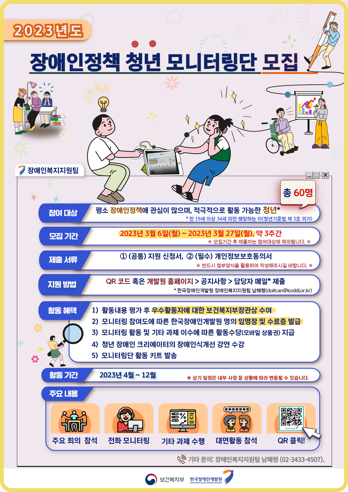 ● 문의 사항 : 한국장애인개발원 장애인복지지원팀 남혜령(02-3433-4507) ★ 2023년도 장애인정책 청년 모니터링단 모집 안내 및 활동 등 관련한 궁금한 사항이 있으시면, 언제든지 연락주세요!
