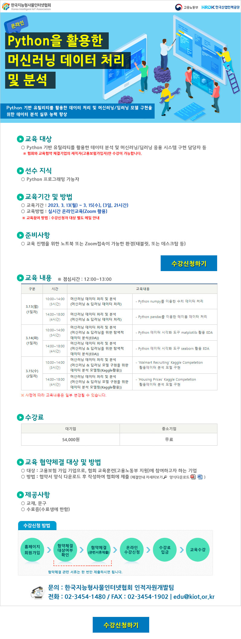 ■ 교육 목표 : Python 기반 유틸리티를 활용한 데이터 처리 및 머신러닝/딥러닝 모델 구현을 위한 데이터 분석 실무 능력 향상 ■ 교육 대상 : Python 기반 유틸리티를 활용한 데이터 분석 및 머신러닝/딥러닝 응용 시스템 구현 담당자 등 ■ 교육 기간 : 2023. 3. 13(월) \~ 3. 15(수) ■ 교육 장소 : ZOOM ■ 준비사항 : 교육 진행을 위한 노트북 또는 ZOOM 접속이 가능한 테블릿 등 ■ 수강료 : (중소기업 재직자) 무료 / (대기업 재직자) 54,000원